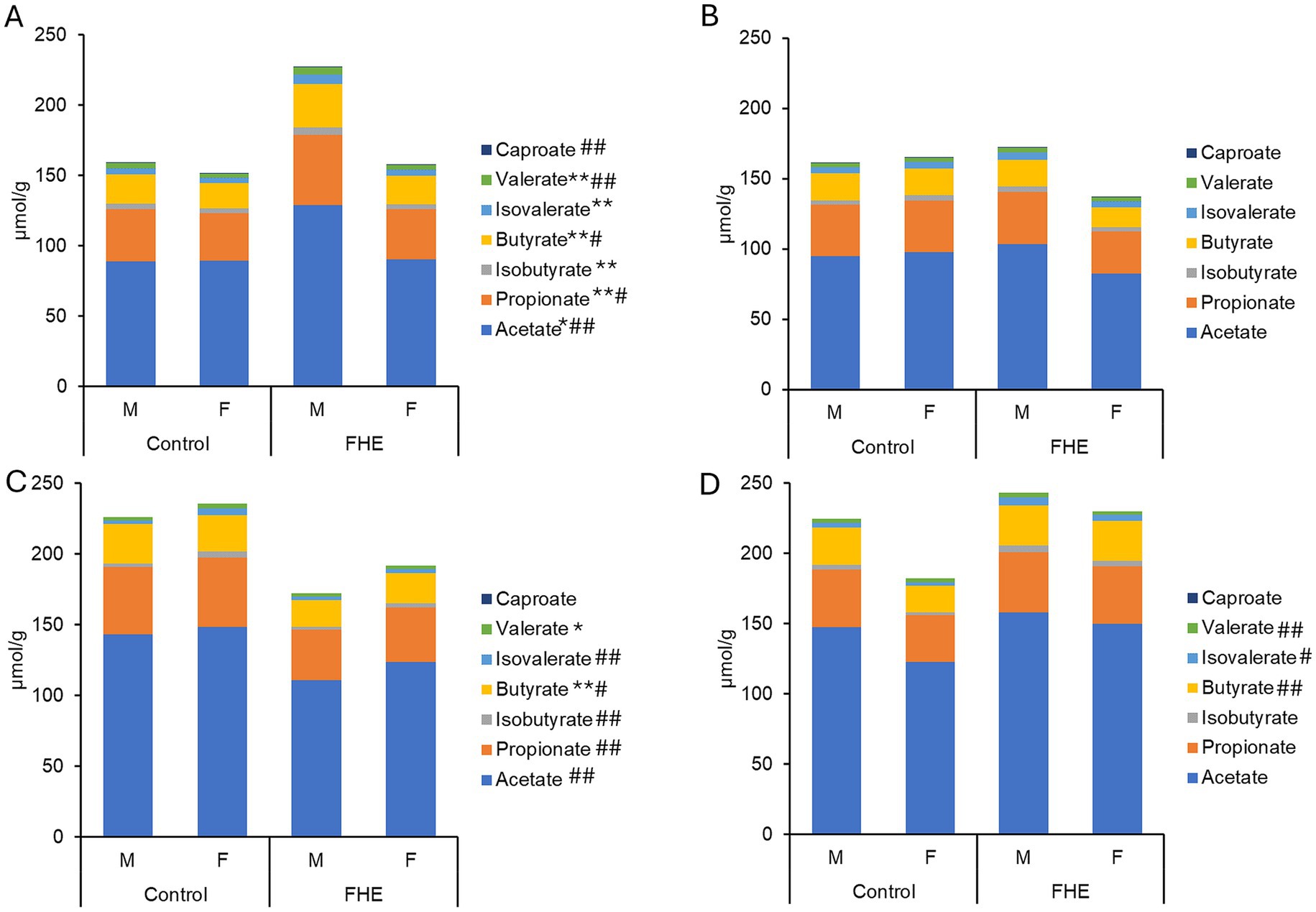 Figure 5. Differences in concentrations of short-chain fatty acids (μmol/g) in feces of pigs fed the control diet or diet with added fermented herbal extract (grey bar): (A) mid-fattening (A) and end of fattening period (B) on Farm B as well as mid-fattening (C) and end of fattening period (D) on Farm C. FHE, fermented herbal extract; F, gilt; M, barrow. Values are least-squares means ± standard error of the mean. Effect of sex: **p < 0.05; *p < 0.10; effect of diet: ## p < 0.05; # p < 0.10.