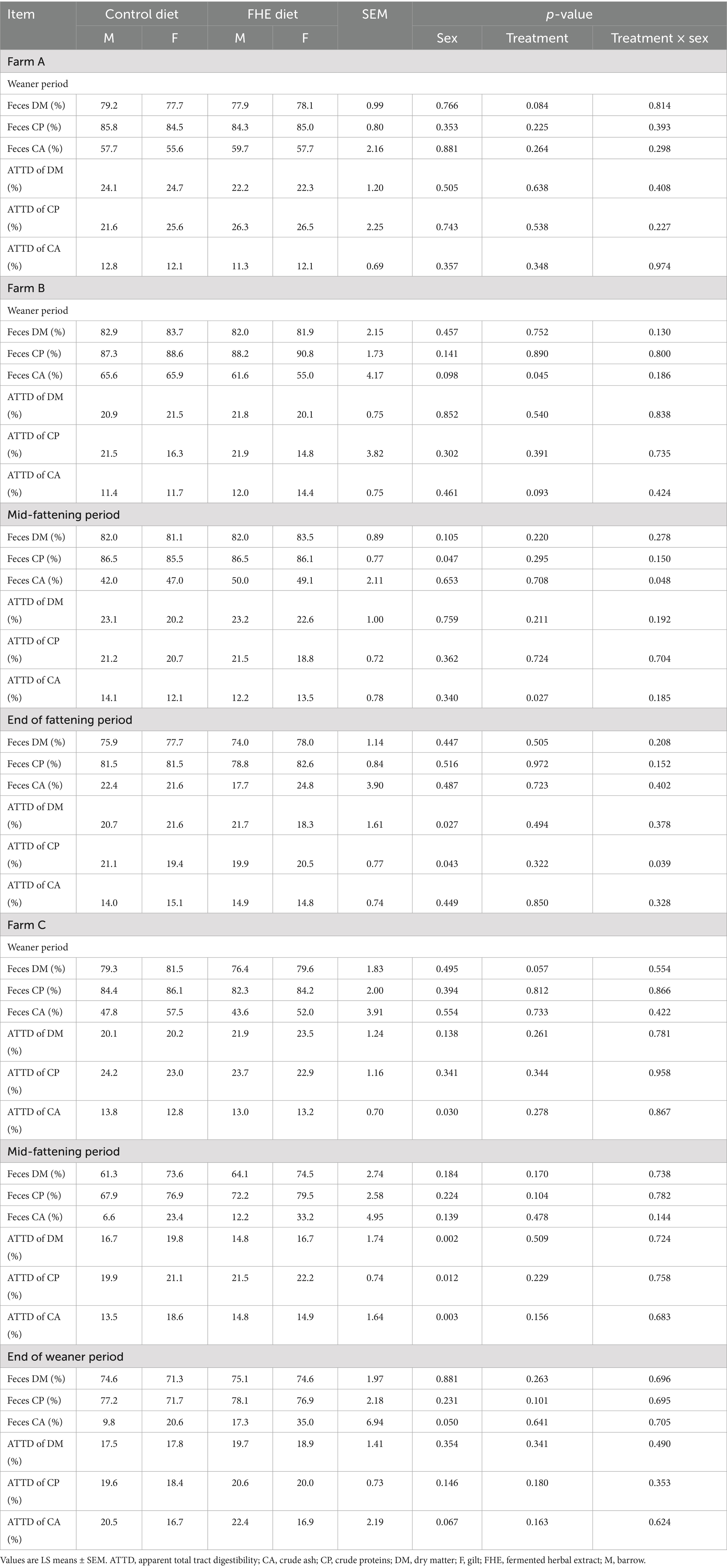 The FHE tended (p = 0.079) to lower the fecal DM content by 8.9% compared to pigs fed the control diet on Farm A. Moreover, on Farm B, the FHE addition tended (p = 0.095) to reduce the ATTD of CA by 11.3% while increasing the fecal CA concentration by 14.0% in the weaner period compared to the control (p = 0.045). When the pigs got older, the FHE addition enhanced the ATTD of CA by 11.5% in the mid-fattening period compared to the control pigs on Farm B (p = 0.027). Furthermore, depending on sex, FHE increased or decreased fecal CA as indicated by the dietary treatment and sex interaction (p = 0.048). Except for a trend for a higher DM content in feces for pigs receiving the FHE diet (p = 0.057) at the end of the weaner period, no differences in the ATTD and contents of nutrients in feces between the two treatments were observed on Farm C.
