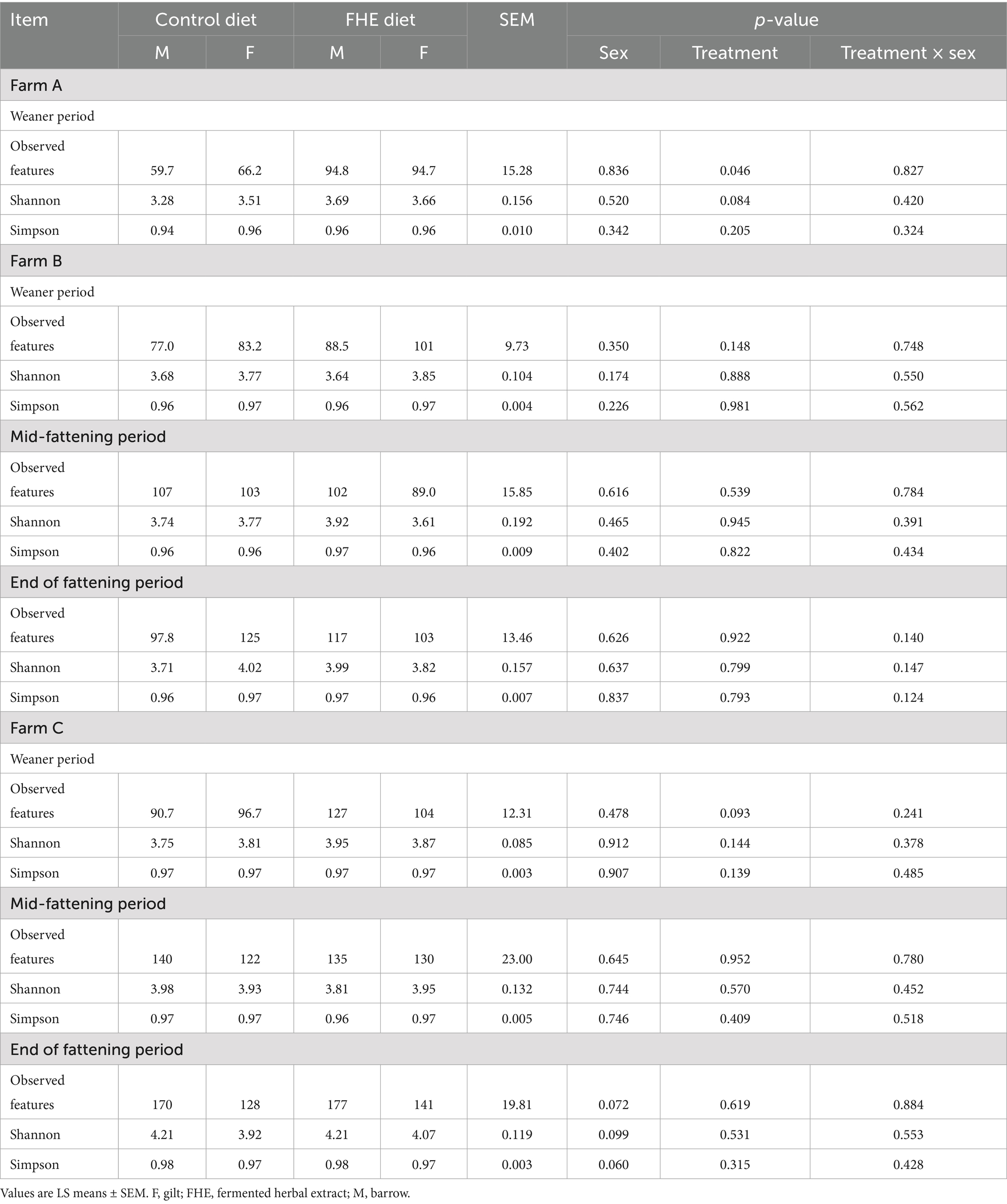 Table 2. Alpha-diversity of bacterial community in feces of pigs fed the control or FHE diet in the weaner and fattening period at the three farms.