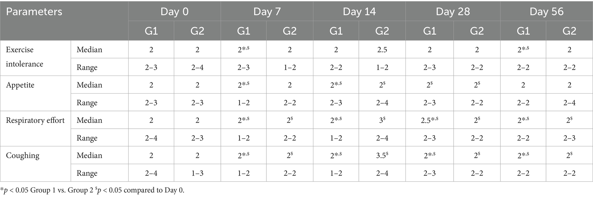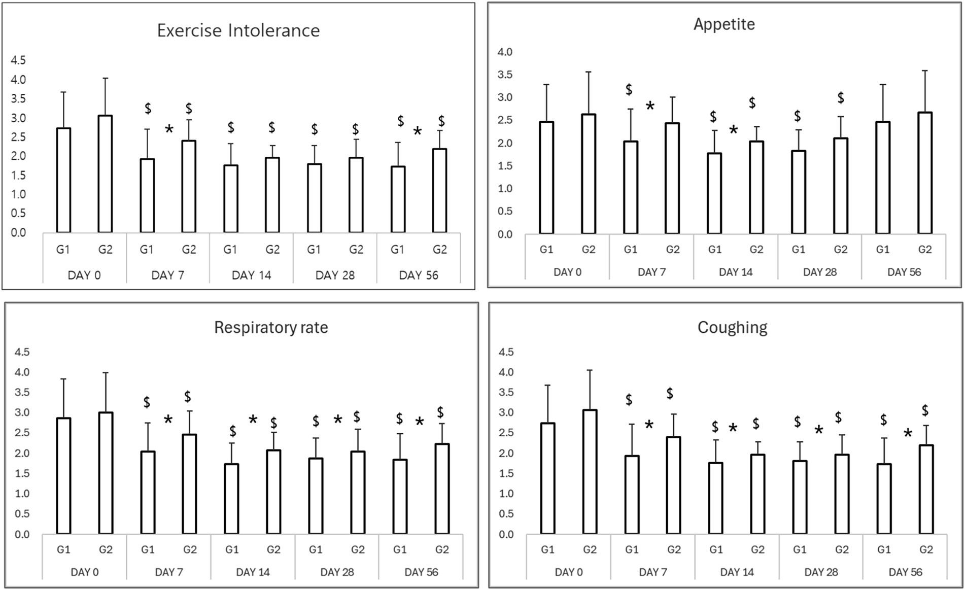 Both treatment groups showed significant improvement in clinical signs, including exercise intolerance, respiratory effort, appetite, and coughing scores (Table 2). By Day 7, 86% of dogs in the Group 1 (test group) showed marked clinical improvement versus 65% in the Group 2 (control group; p < 0.05). This trend persisted throughout the study period, with Group 1 maintaining a more consistent and sustained improvement (Figure 1).