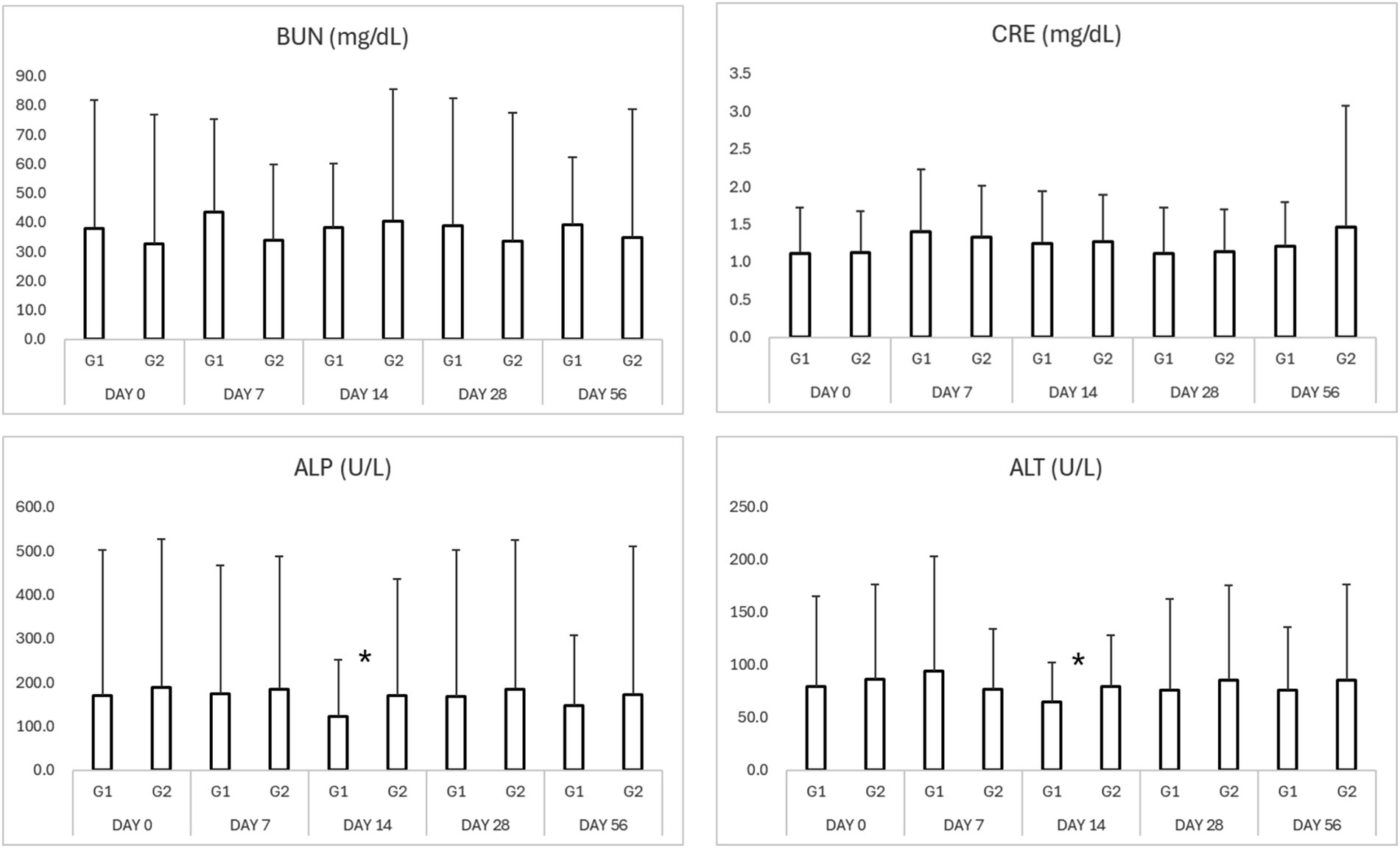 Figure 2. Results of serum biochemistry in study period. *p < 0.05 Group 1 vs. Group 2 $p < 0.05 compared to Day 0. BUN, blood urea nitrogen; CRE, creatinine; ALP, alkaline phosphatase; ALT, alanine aminotransferase.