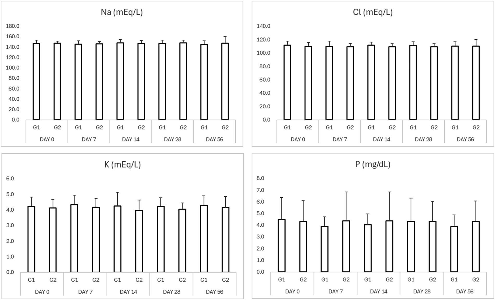 Figure 3. Results of serum electrolytes in study period. *p < 0.05 Group 1 vs. Group 2 $p < 0.05 compared to Day 0. Na (sodium), K (potassium), Cl (chloride), and P (phosphorus).