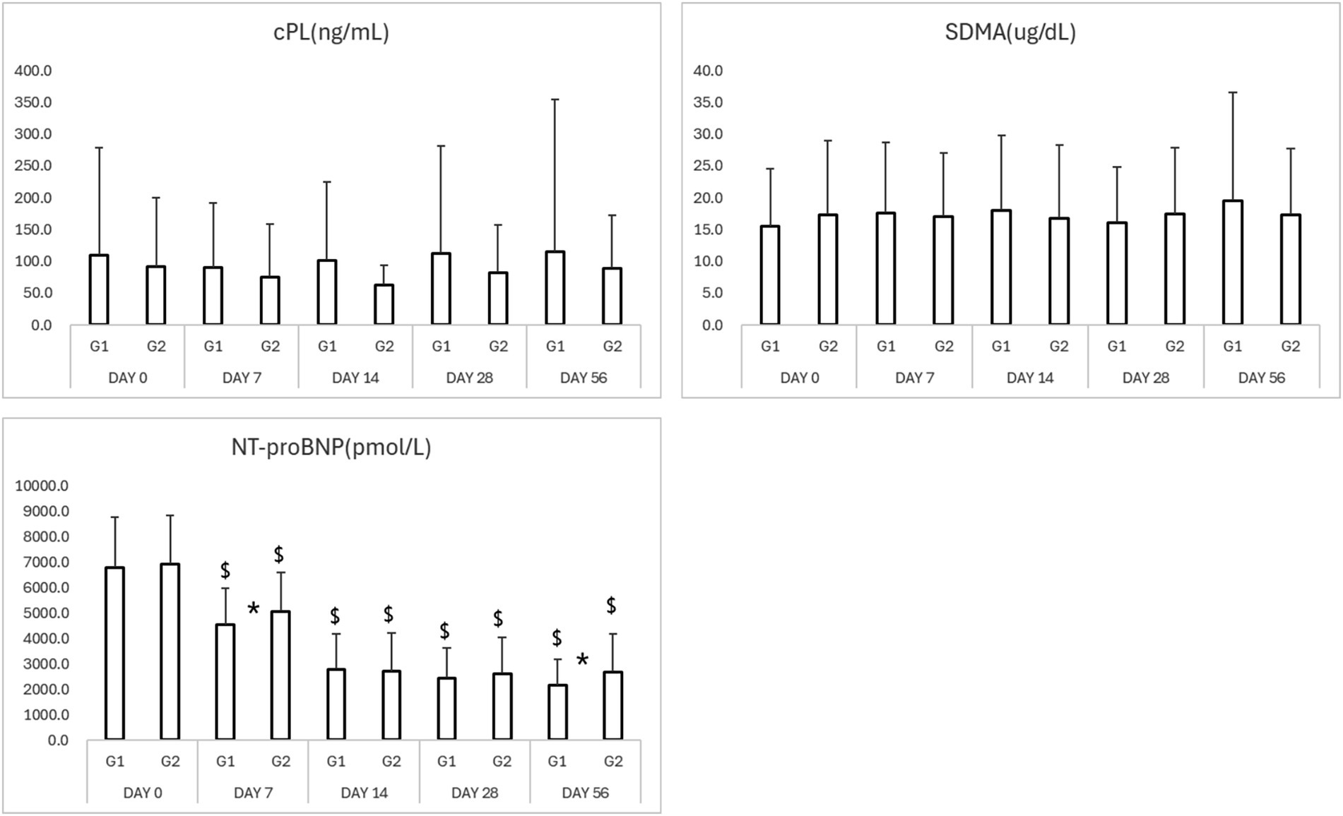 Figure 4. Results of biomarkers in study period. *p < 0.05 Group 1 vs. Group 2 $p < 0.05 compared to Day 0. cPL, canine pancreatic lipase; SDMA, symmetric dimethylarginine; NT-proBNP, N-terminal pro B-type natriuretic peptide.