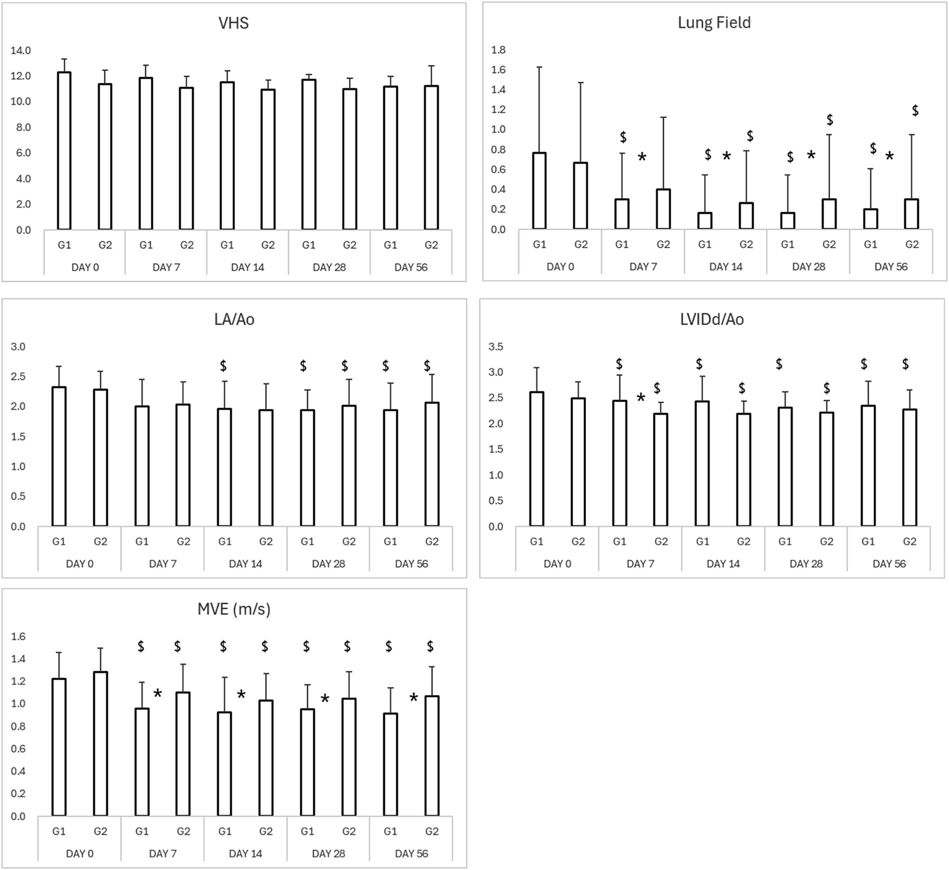 Figure 5. Results of thoracic radiography and echocardiography in study period. *p < 0.05 Group 1 vs. Group 2 $p < 0.05 compared to Day 0. VHS, vertebral heart score; LA/Ao, left atrium-to-aortic root ratio; LVIDd/Ao, left ventricular internal diameter in diastole-to-aortic root ratio; MVE, mitral valve E-wave, early diastolic filling velocity.
