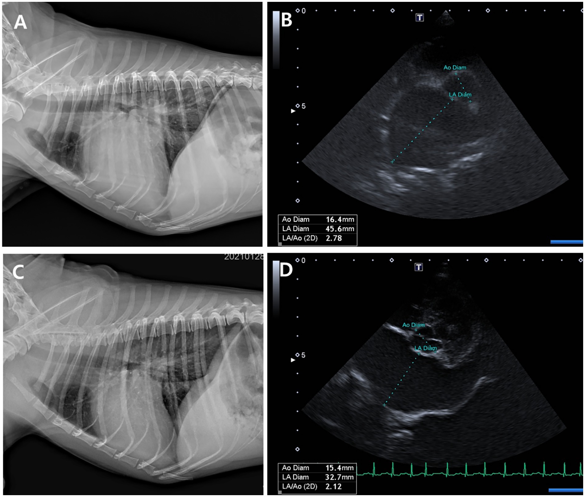 Figure 6. Thoracic radiographs (A, C) and echocardiographic images (B, D) from a Group 1 (test group) dog, taken before and 56 days after treatment with the combination tablet (ForteGold). Following treatment, the vertebral heart scale (VHS) and vertebral left atrial size (VLAS) on thoracic radiography decreased from 12.0 and 2.8 to 10.5 and 2.2, respectively (A, C). Similarly, the left atrial-to-aortic root diameter ratio (LA/Ao) on echocardiography was reduced from 2.78 to 2.1 (B, D).