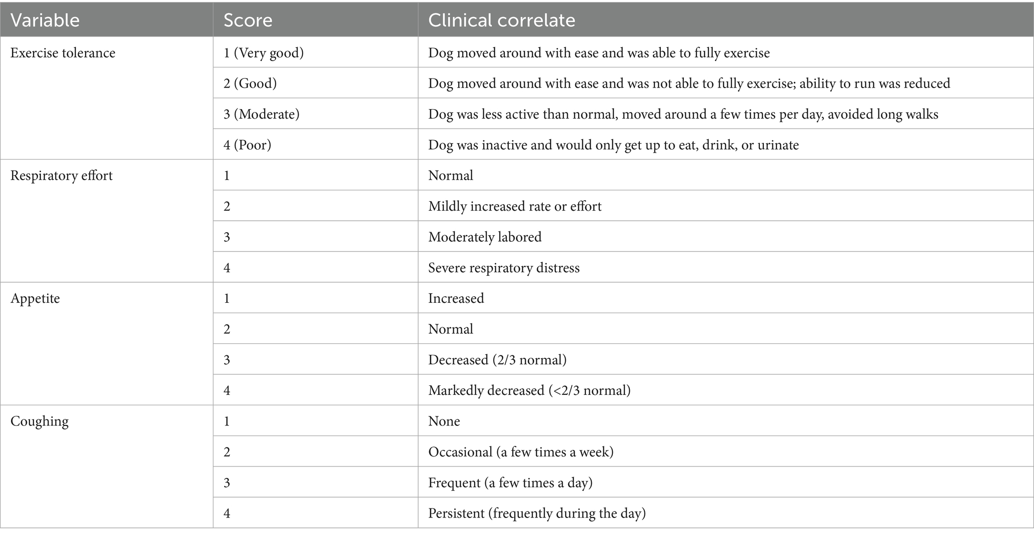 • Clinical evaluation: exercise intolerance (scored 1–4), appetite, respiratory effort, and coughing (Table 1).