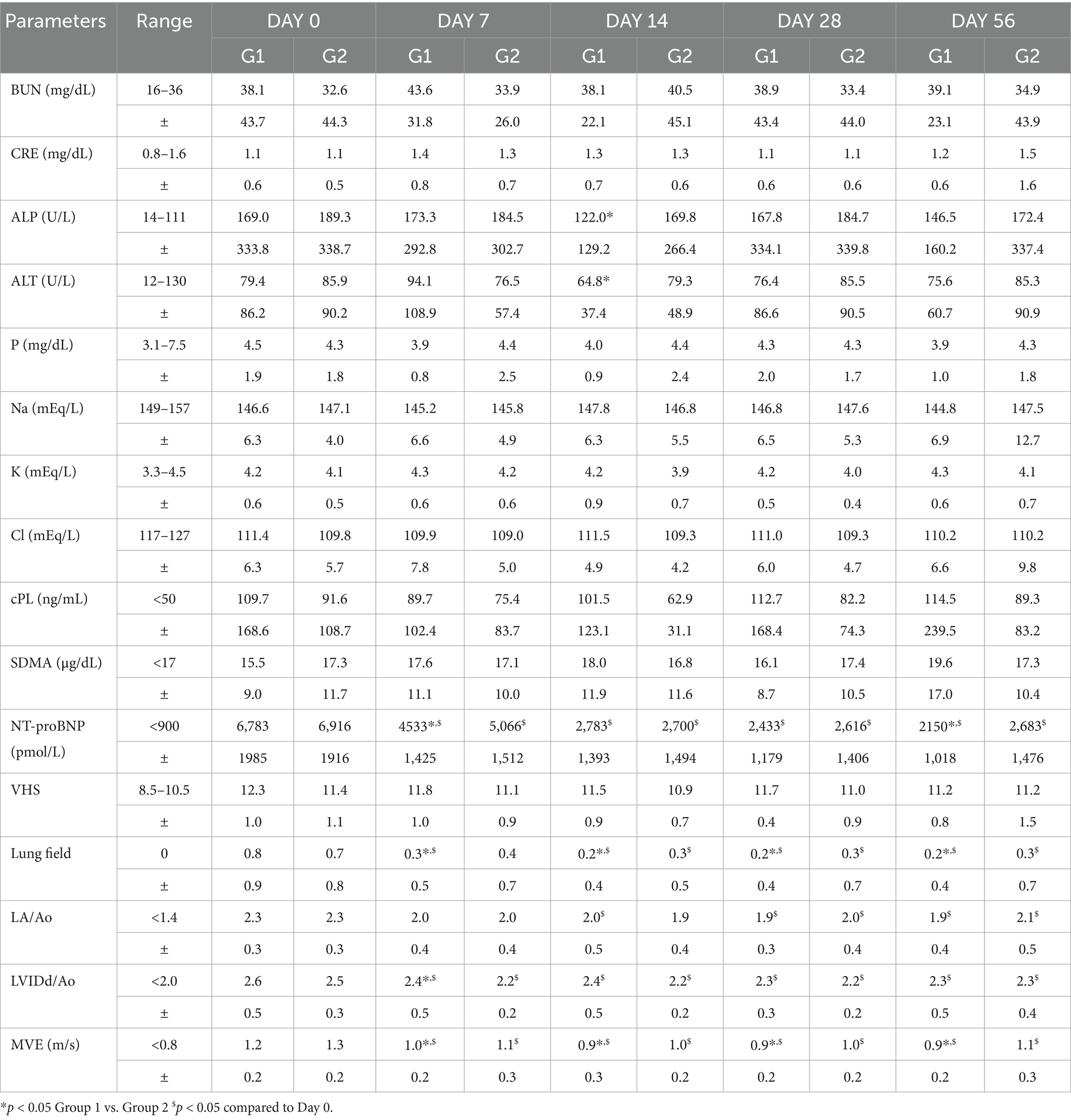 Statistical analyses were conducted using SPSS software (IBM, New York, United States). The minimum sample size required (N = 60) was determined based on a significance level of 0.05, a sample correlation coefficient (r) of 0.4 derived from a pilot study, and a desired power of 0.8. To account for potential loss of follow-up, a target sample size of 60 was established. The parameters (effect size = risk difference of 20%, α = 0.05, power = 80%) were used for sample size calculation. The primary endpoint was a composite of the development of left-sided CHF, or euthanasia for a cardiac reason, or death presumed to be cardiac in origin in dogs in the PP population. The normality of the data was assessed using the Kolmogorov–Smirnov normality test. Normally distributed data are presented as mean ± standard deviation while data not normally distributed are presented as median (interquartile range, IQR). For normally distributed variables, an unpaired t-test was employed to compare mean differences in variables between Group 1 (test) and 2 (control). In cases where variables were not normally distributed, the non-parametric Mann–Whitney U-test for independent samples was utilized to evaluate distributional differences between test groups. To assess within-group changes, the Wilcoxon signed-rank test was used for non-normally distributed (non-parametric) variables, and repeated measures ANOVA were applied for normally distributed (parametric) variables. We analyzed the longitudinal data using a linear mixed-effects model to account for repeated measures within subjects. The fixed effects included group (treatment vs. control) and time (baseline, Day 7, Day 14, Day 28, and Day 56) to assess differential changes over time between groups. We assumed an autoregressive (AR1) covariance structure to model the correlation between repeated measures over time. All statistical tests were two-sided on a 5% level of significance (α = 0.05) with Bonferroni correction for multiple analyses, in order not to inflate the type II error, using SPSS software (IBM, New York, United States).