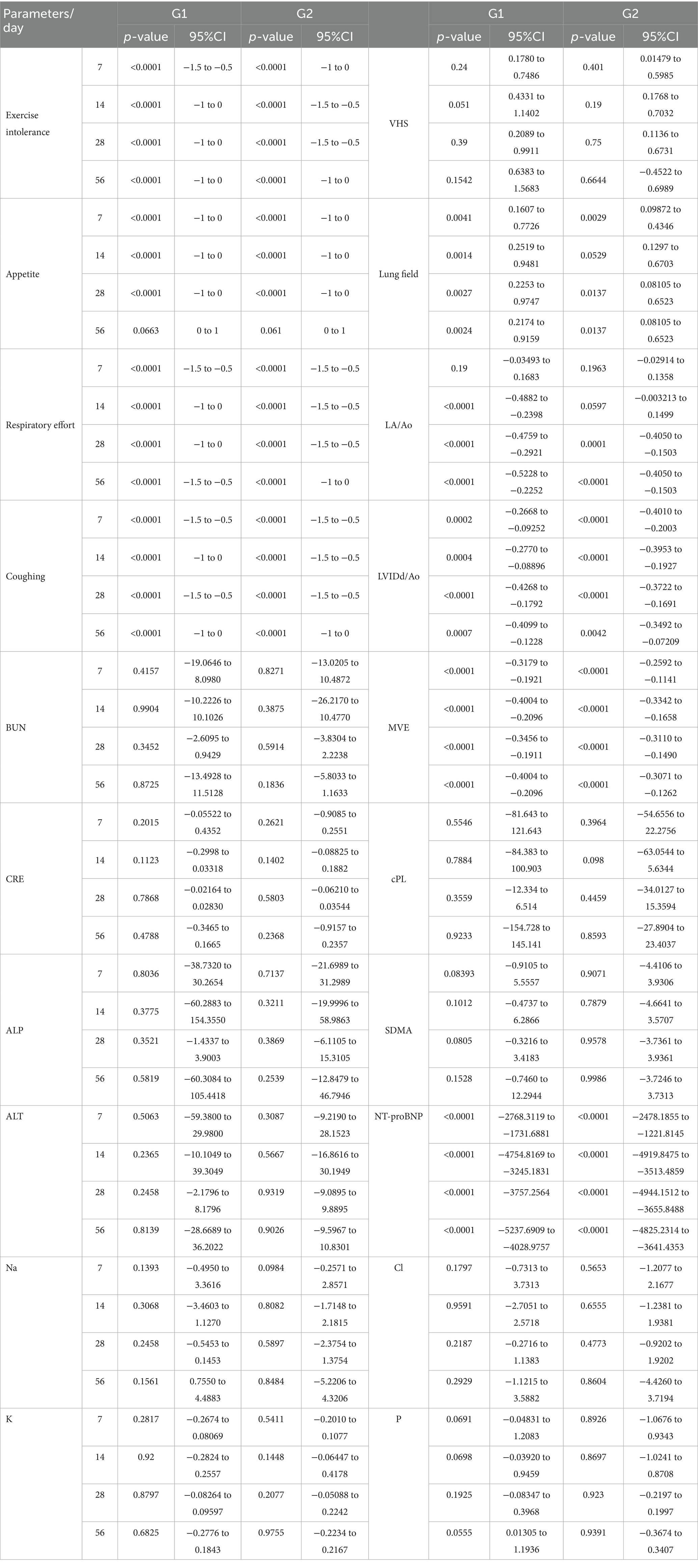 Evaluations were conducted on Days 0, 7, 14, 28, and 56. Dogs exhibiting treatment failure, worsening clinical signs, or mortality from heart failure were excluded from further analysis. Assessment parameters included: