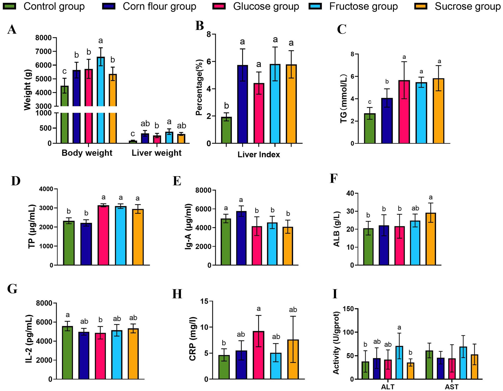 Bar graphs labeled A to I compare various health metrics across five groups: control, corn flour, glucose, fructose, and sucrose. Metrics include weight (body and liver), liver index, triglycerides, total protein, immunoglobulin A, albumin, interleukin-2, C-reactive protein, and enzyme activity (ALT and AST). Bars are color-coded per group, with statistical significance denoted by different letters above the bars.