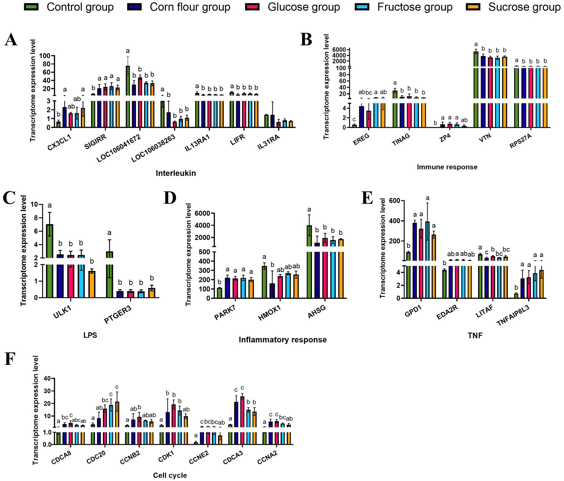Bar graphs display transcriptome expression levels across various genes for six groups: Control, Corn flour, Glucose, Fructose, and Sucrose. Panels A to F represent different biological pathways, including Interleukin, Immune response, LPS, Inflammatory response, TNF, and Cell cycle, respectively. Each graph shows variations in expression levels with statistical significance indicated by different letters over the bars.