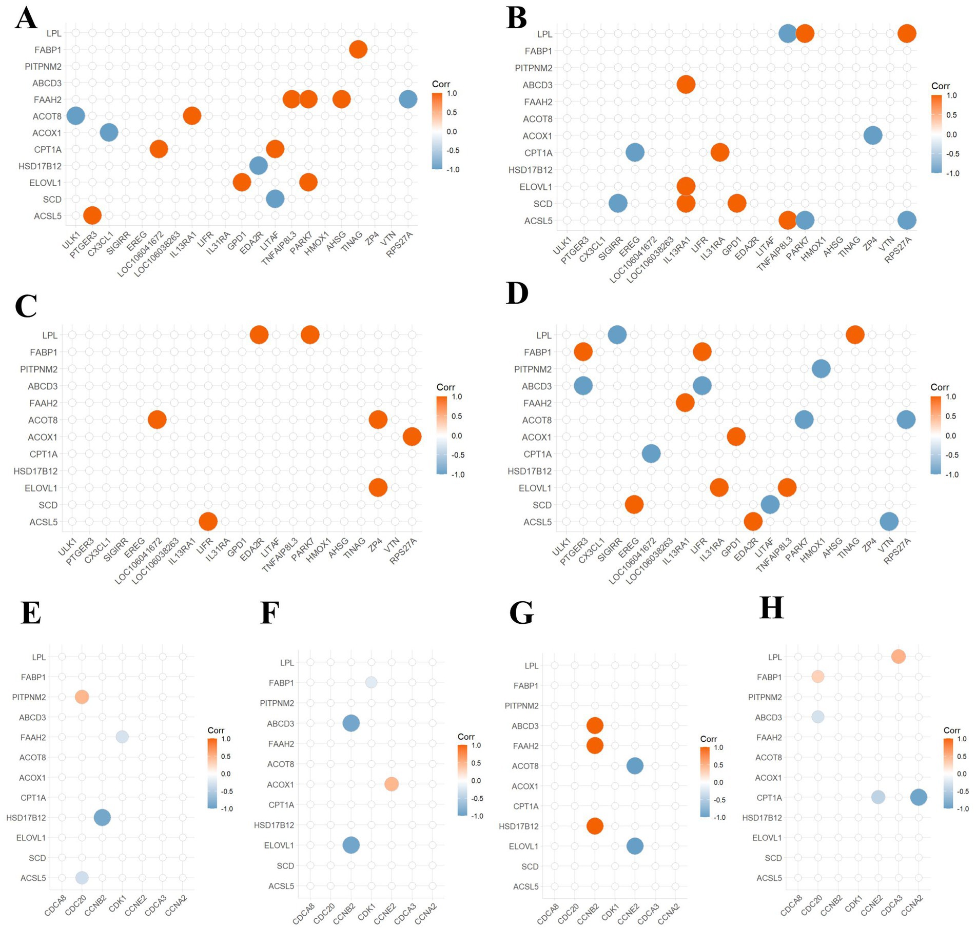 Figure 3. Correlation analysis between lipid metabolism genes and DEGs in inflammation, immunity, and cell cycle. (A,E) Correlation analysis for the cornmeal group. (B,F) Correlation analysis for the glucose group. (C,G) Correlation analysis for the fructose group. (D,H) Correlation analysis for the sucrose group. The horizontal axis is interpreted as in Figure 5. Genes on the vertical axis such as CPT1A, ACOX1, ACOT8, and FAAH2 are related to lipid oxidation. Genes ABCD3 and PITPNM2 are related to lipid transport. Genes FABP1 and LPL are related to lipid catabolism. The size of the circles and the darkness of the color indicate the strength of the correlation. The larger the circle and the darker the color, the stronger the correlation. Red indicates positive correlation, and blue indicates negative correlation.