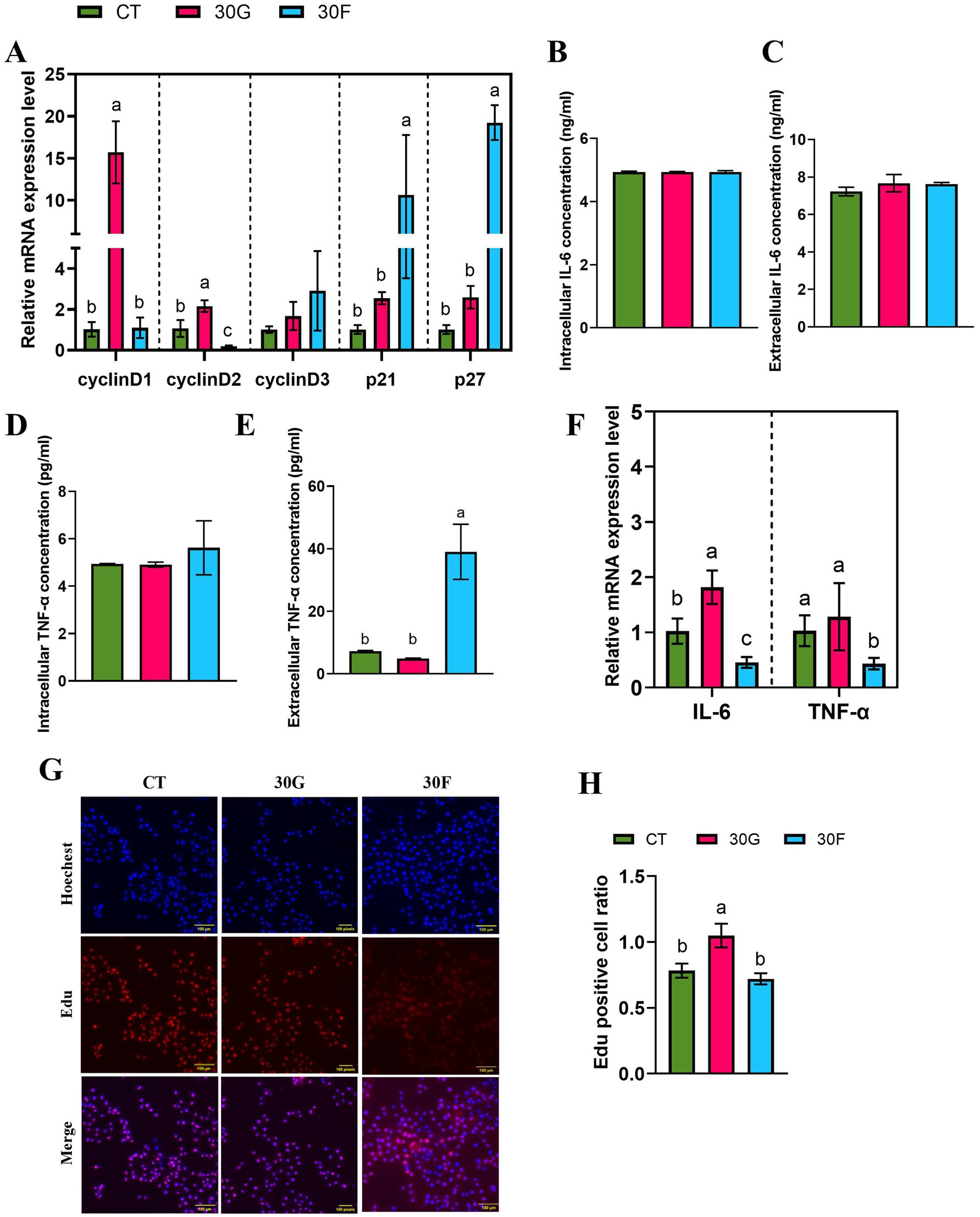 Bar graphs and fluorescence images show cell experiments with different treatments, labeled CT, 30G, and 30F. Panels A-F display relative mRNA expression levels and concentrations of cyclins, IL-6, and TNF-α, with statistical significance marked by letters. Panel G contains fluorescence microscopy images showing cell nuclei (Hoechst), EdU staining, and merged views. Panel H presents the EdU positive cell ratio. Each treatment shows specific cellular responses and expression levels.