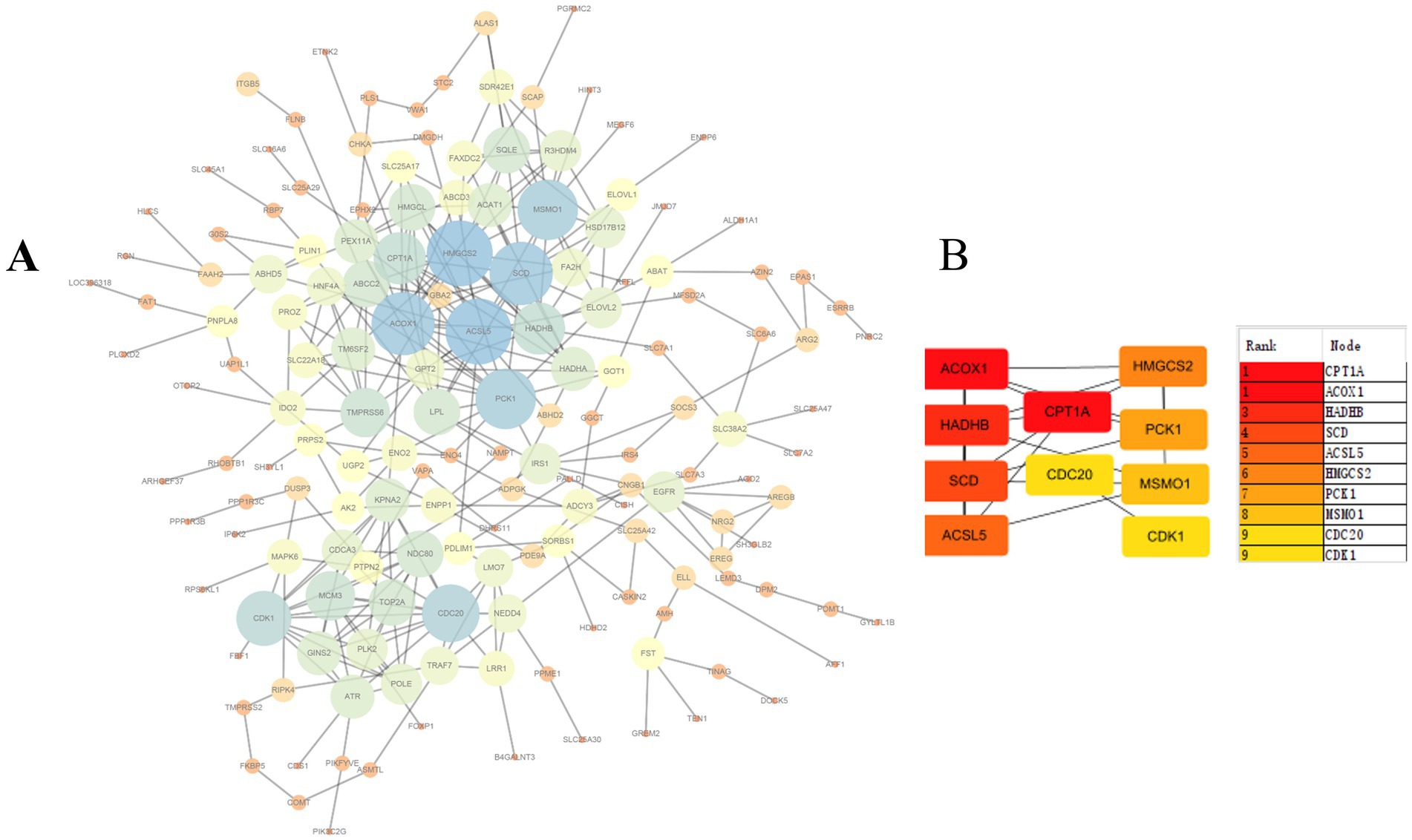 Figure 5. Protein–protein interaction (PPI) network. (A) The network consists of 161 nodes and 323 edges. (B) Ranking of top 10 hub genes in the PPI network using MCC (Maximal clique centrality) method.