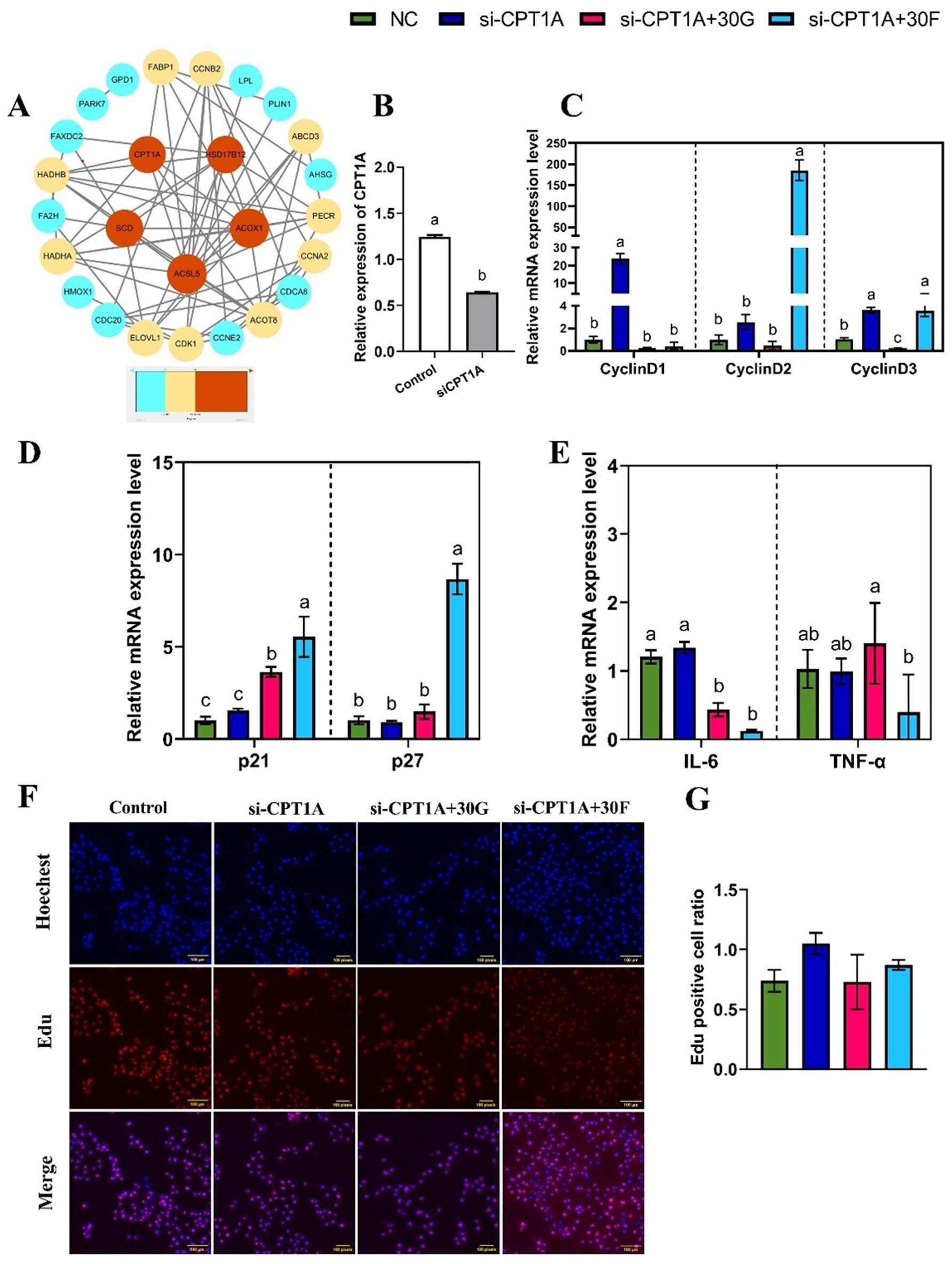 Figure 6. Effects of glucose and fructose treatments and interference with CPT1A on inflammatory cytokines and cyclin in goose primary hepatocytes. (A) PPI network of DEGs, those genes are shown, gradient colors indicate the strength of the DEGs correlation. (B) mRNA expression levels of CPT1A interference (si-CPT1A) and siRNA negative control (NC) in primary goose hepatocytes. (C, D, E) mRNA expression levels of CyclinD1, CyclinD2, CyclinD3, p21, p27, TNF-α, and IL-6. (F, G) EdU staining-positive hepatocytes detected by the EdU assay kit. Abbreviations: Control, control group; si-CPT1A, negative control; si-CPT1A + 30G = CPT1A interference combined with 30 mmol/L glucose treatment; si-CPT1A + 30F=CPT1A interference combined with 30 mmol/L fructose treatment. EdU (red), Hoechst (blue); n = 3. Different lowercase letters on top of the bar charts indicate differences between treatments (p < 0.05).