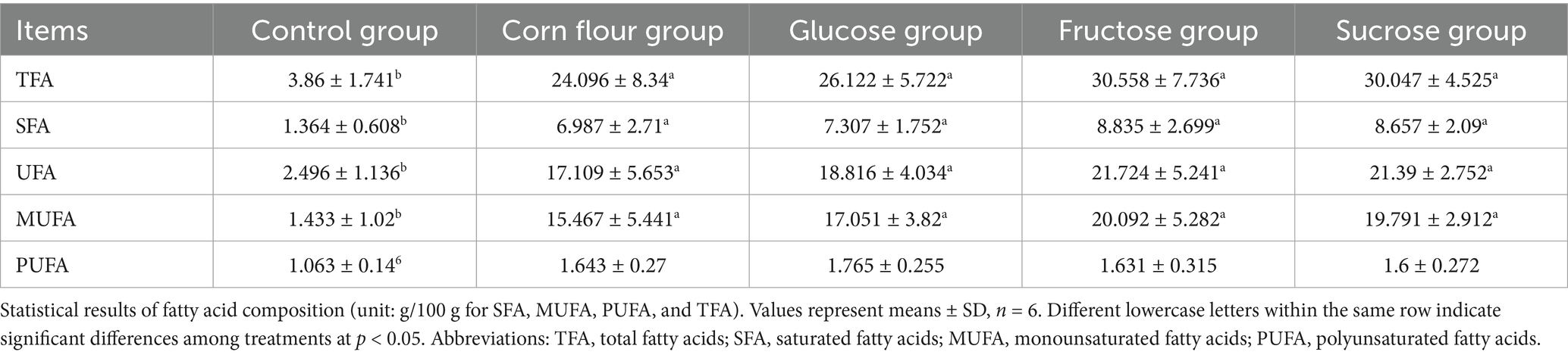 Table 2. Effect of different types of sugar (glucose, fructose, and sucrose) on fatty acid composition.