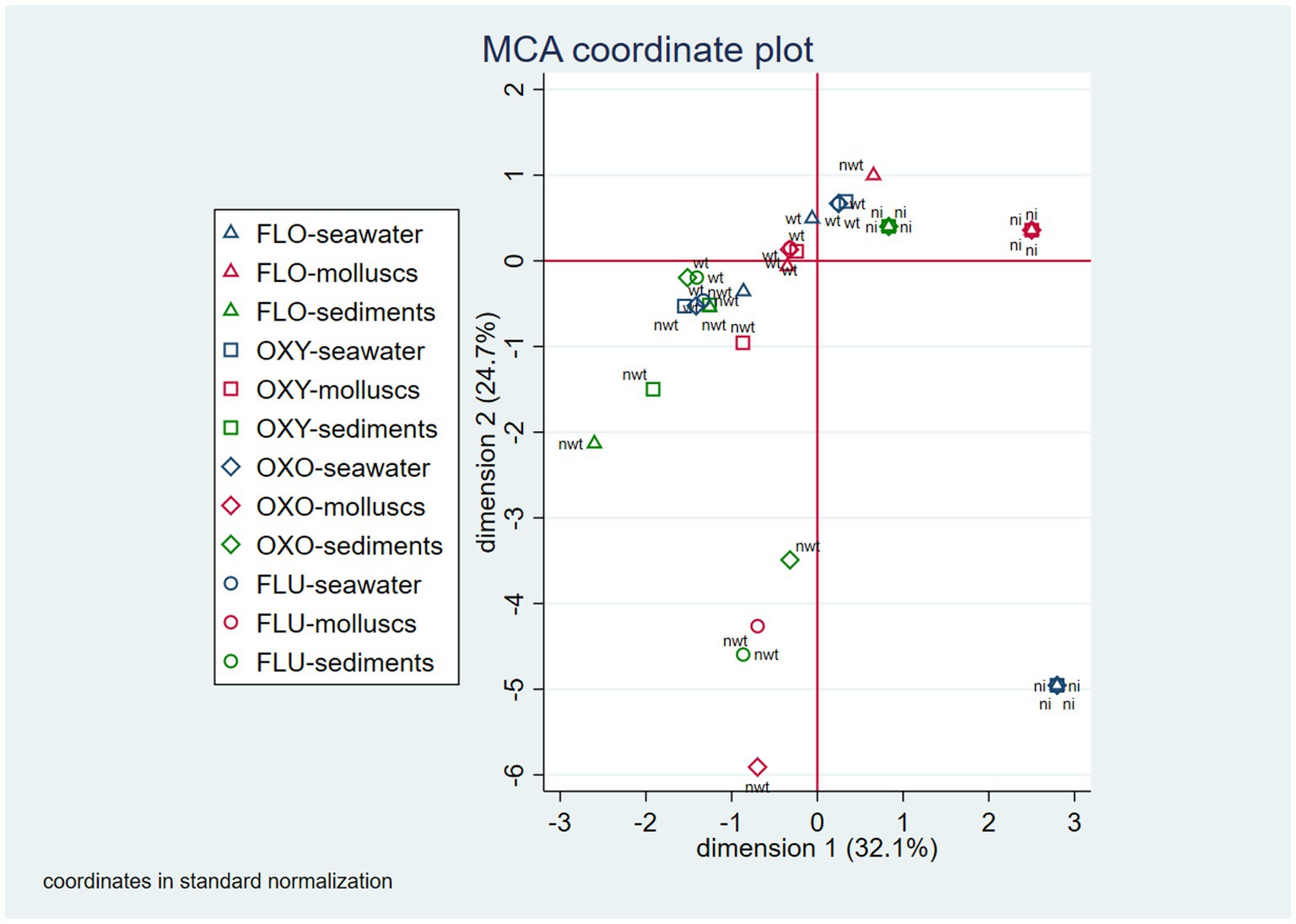 Regarding the isolation and resistance patterns observed at the sampling site level, the MCA analysis suggests that in most of the sites, E. coli was isolated simultaneously from mollusks and seawater, but not from sediments; only on a few occasions, E. coli was found in either seawater or mollusks. This indicates a high degree of concordance in E. coli isolation between the seawater and the mollusk compartments. At the same time, the MCA analysis shows that when NWT E. coli was detected for florfenicol in seawater, it was generally also detected in the same compartment for oxytetracycline, for oxolinic acid, and for flumequine. Detection of resistant E. coli in other compartments was not as consistent among the four antibiotics studied. These results support the idea that seawater is the most appropriate compartment for monitoring AMR of aquaculture origin in the Chilean marine environment.