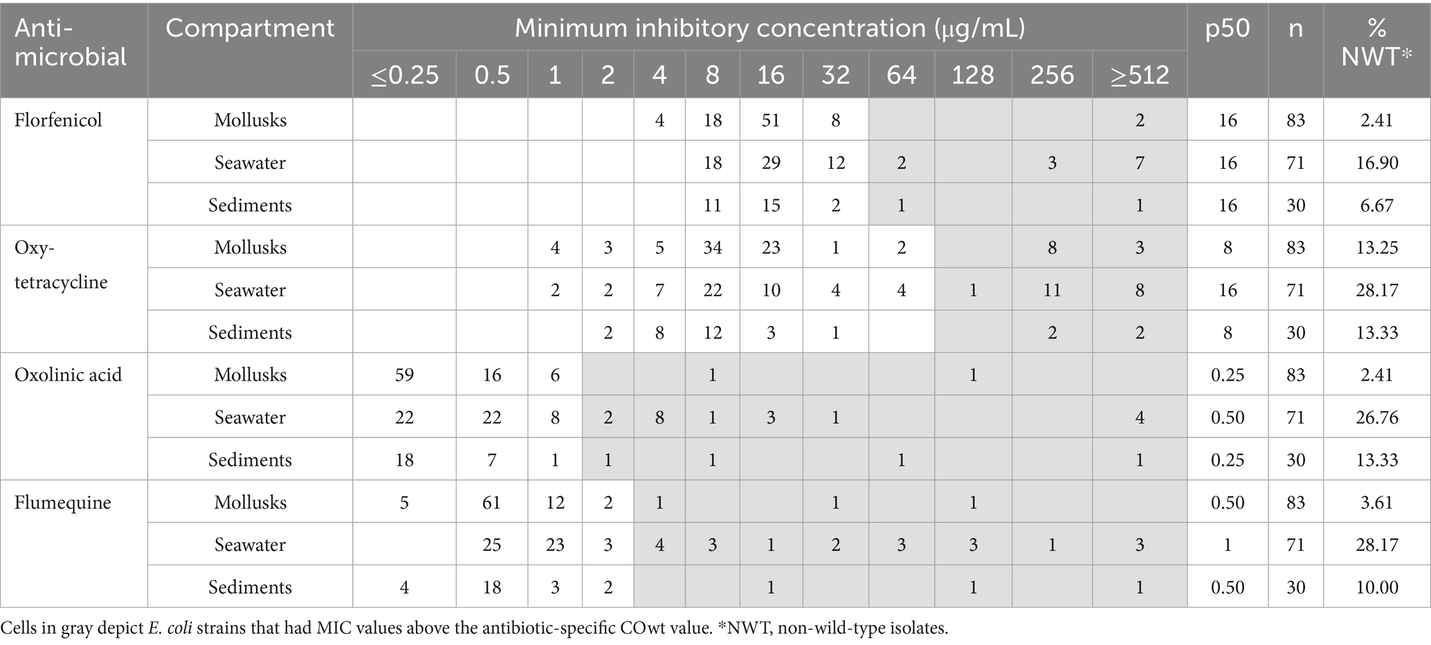 Table 1. Distribution of minimum inhibitory concentrations (MIC) for florfenicol, oxytetracycline, oxolinic acid, and flumequine for the 184 E. coli strains isolated from the mollusk, seawater, and sediment compartments.