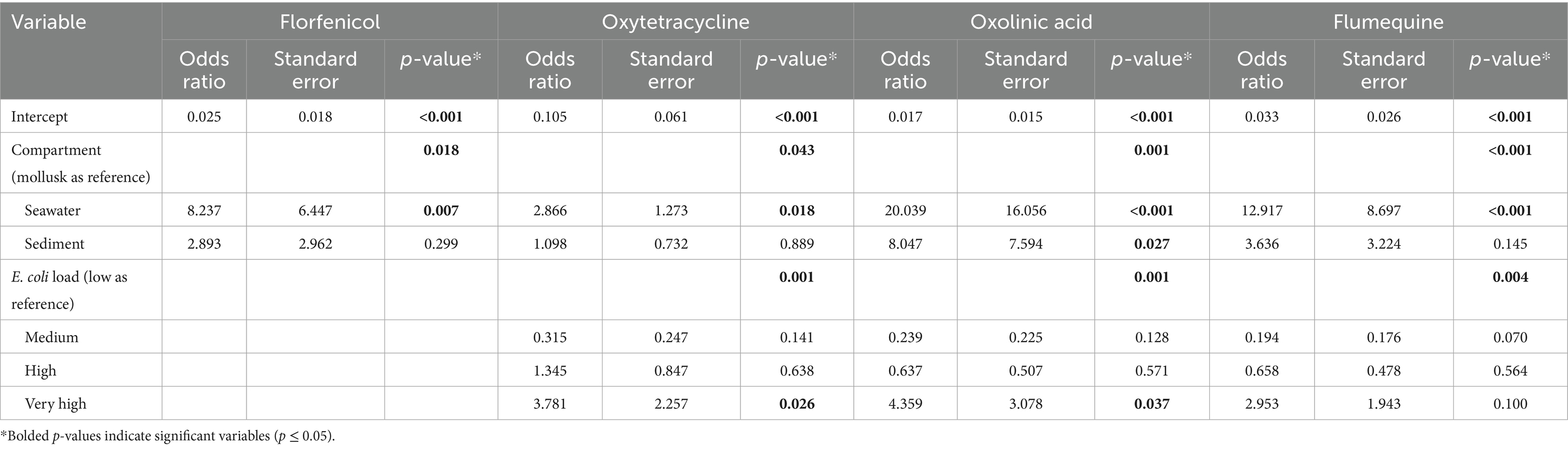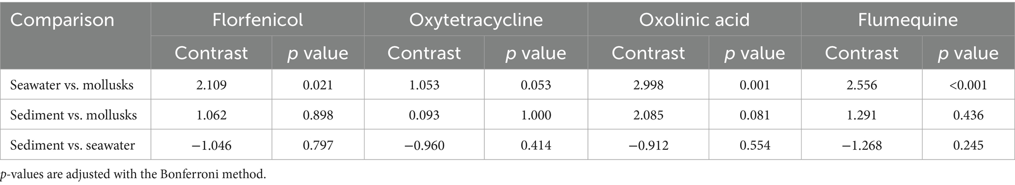 The mollusks sampled in this study belong to the classes Bivalvia and Gastropoda, which have different feeding behaviors. While bivalves feed by filtering suspended particles, having more direct contact with seawater, limpets and snails are mainly grazing herbivores, scraping food from surfaces (79). However, these differences did not affect the results of this study. When gastropods were excluded from the analysis, the probability of isolating E. coli in the mollusk compartment increased slightly, from 0.822 to 0.829. Similarly, the prevalence of florfenicol-NWT E. coli in mollusks decreased by only 1%, whereas the prevalence of oxytetracycline, oxolinic acid and flumequine NWT E. coli increased by negligible amounts (<0.5%). These changes in probabilities and prevalences did not affect the significance of the statistical models.