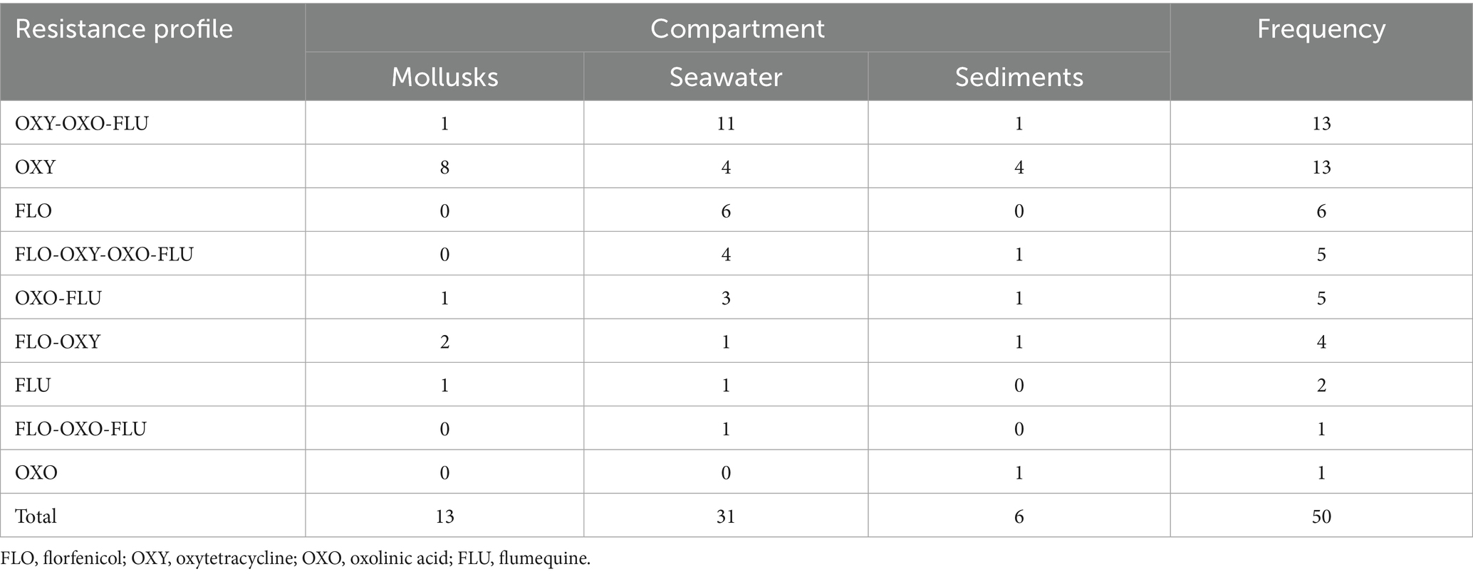 MIC median values for florfenicol in the three compartments were 16 μg/mL with a minimum ranging between 4 and 8 μg/mL, and a maximum of ≥512 μg/mL. In the case of oxytetracycline, the median of MIC was 8 μg/mL (range 1 – ≥ 512 μg/mL) in mollusks, 16 μg/mL (range 1– ≥ 512 μg/mL) in seawater, and 8 μg/mL (range 2– ≥ 512 μg/mL) in sediments. MIC median values for oxolinic acid reached 0.25 μg/mL (range ≤0.25–128) in mollusk samples, 0.5 μg/mL (range ≤0.25– ≥ 512 μg/mL) in seawater samples, and 0.25 μg/mL (range ≤0.25– ≥ 512 μg/mL) in sediment samples. Finally, median MIC values for flumequine across compartments were 0.50 μg/mL (range ≤0.25–128 μg/mL) in mollusks, 1 μg/mL (range 0.5–≥ 512 μg/mL) in seawater, and 0.50 μg/mL (range ≤0.25– ≥ 512 μg/mL) in sediments (Table 1).