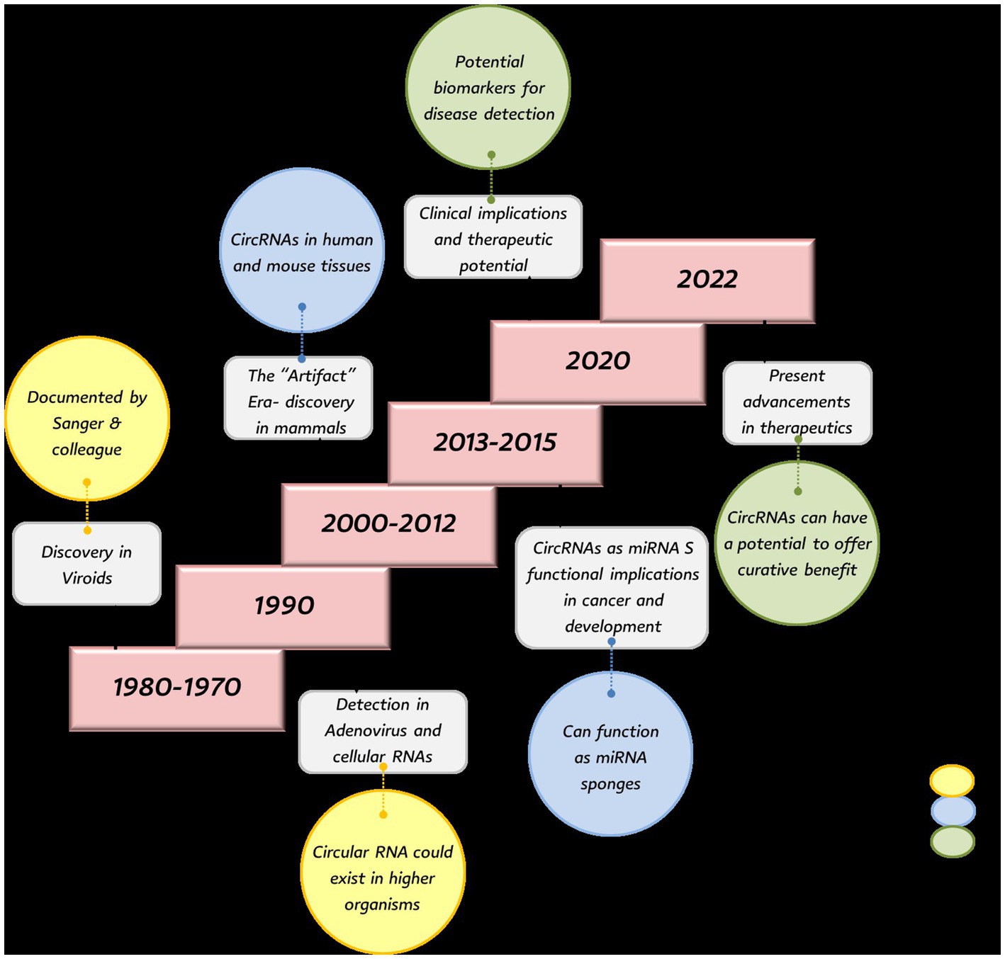 In 2012, high-throughput RNA sequencing (RNA-seq) transformed non-coding RNA research and revealed numerous circRNAs in mammalian cells. A landmark study by Salzman et al. (18) showed that circRNAs are abundant, stable, and not splicing errors, but rather a distinct class of transcripts with potential biological functions. This marked a paradigm shift in RNA biology, distinguishing circRNAs from linear mRNAs. Subsequent studies revealed that circRNAs can serve as crucial regulators of cellular processes. Advances in RNA-seq have since confirmed that thousands of circRNA types are expressed across metazoans. Figure 1 summarizes the historical background of circRNAs.