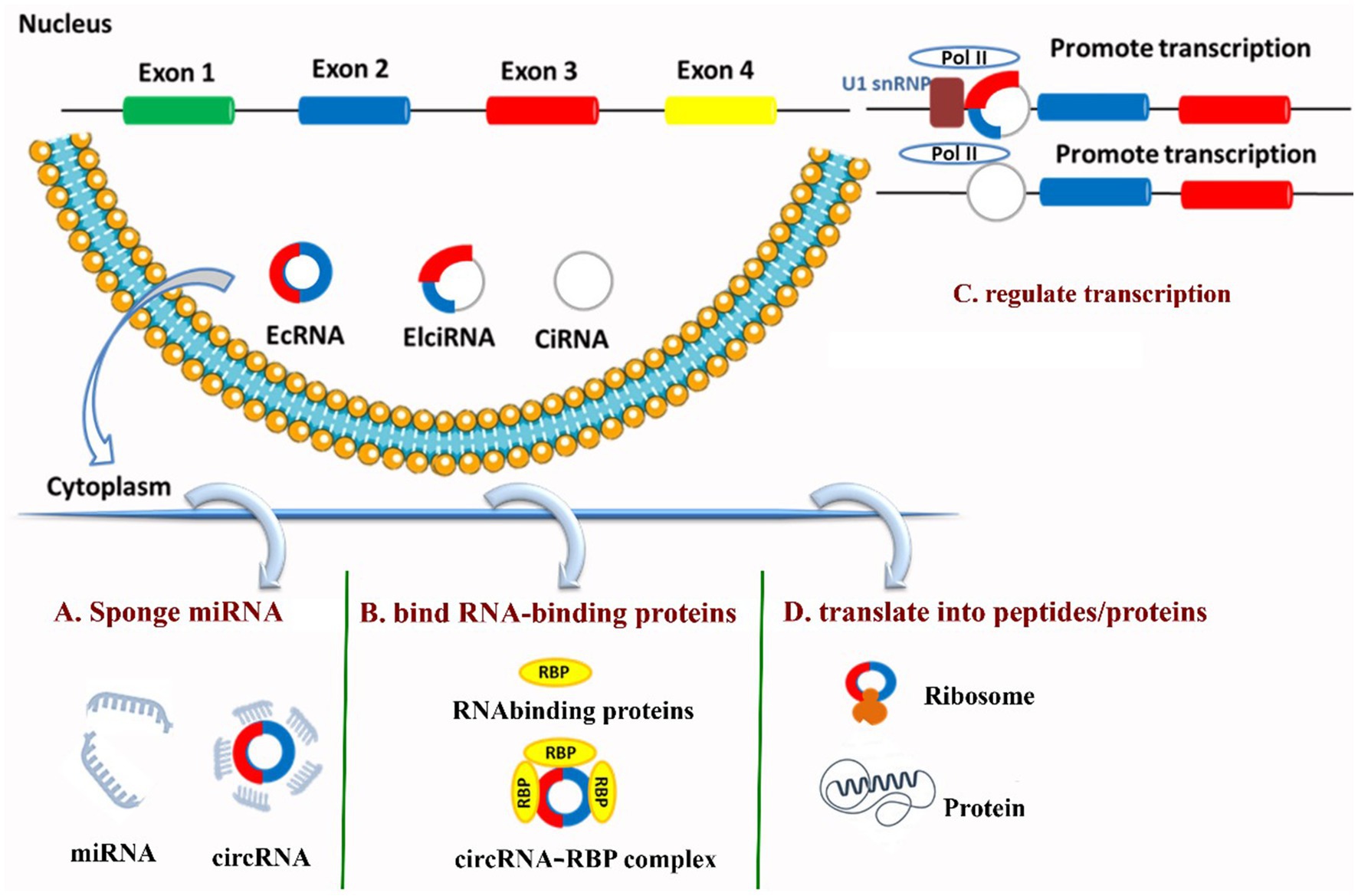 Figure 2. Four canonical circRNA functions [adapted from Zhang et al. (52)]. (A) Sponge miRNA and relieve repression on target mRNAs (ceRNA model). (B) Bind RNA-binding proteins and act as decoy/scaffold to modulate protein localization and activity. (C) Regulate transcription of parental genes, with EIciRNAs/ciRNAs engaging RNA polymerase II and/or U1 snRNP at promoters. (D) Translate into peptides/proteins via cap-independent initiation mediated by IRES elements or m6A.