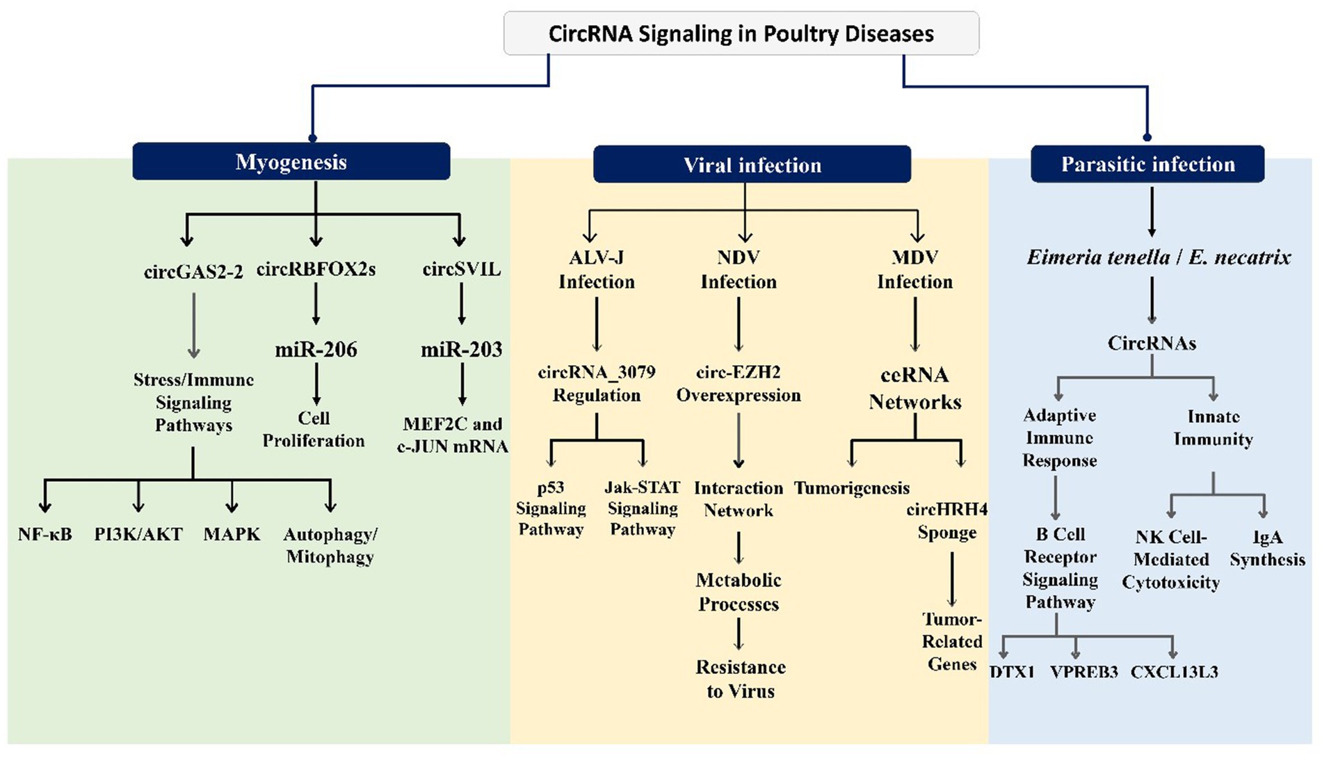 This mechanistic framework, immune hijacking and metabolic reprogramming, provides the conceptual foundation for interpreting circRNA functions in poultry diseases, where similar regulatory principles likely operate through species-specific molecular networks.