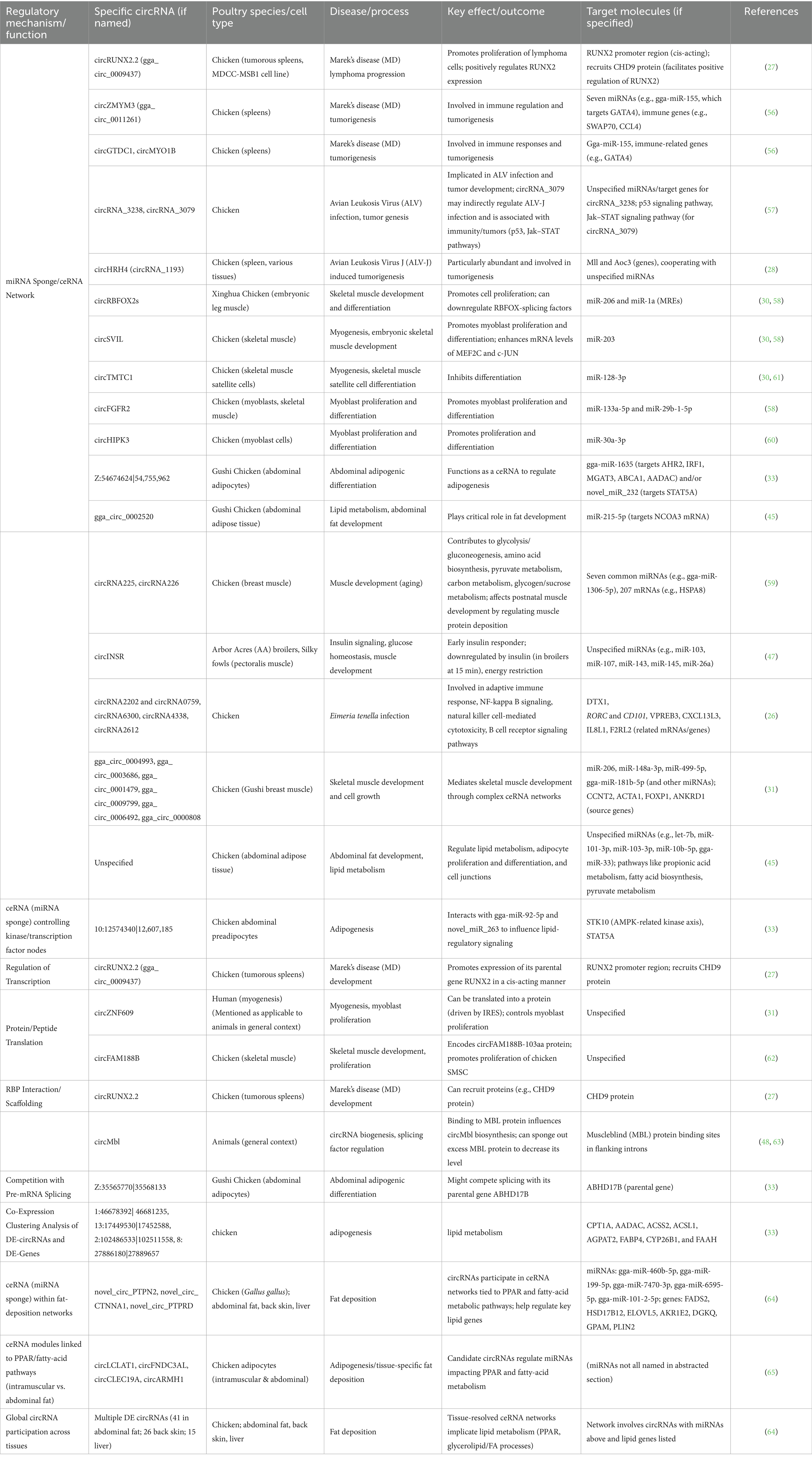 Table 1. Poultry circRNA regulatory mechanisms, targets, and phenotypes (avian experimental evidence).