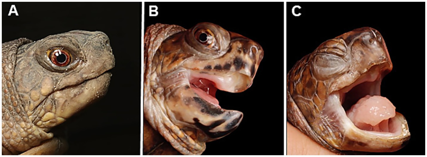 Figure 1. Appearance of captive eastern box turtles (Terrapene carolina carolina) involved in a ranavirus outbreak in Japan. (A) A clinically healthy individual. (B) Mild case showing open-mouth breathing and oral discharge. (C) Severe case exhibiting palpebral edema and closed eyes. The tongue is pale, suggesting anemia, and swollen, indicating glossitis.