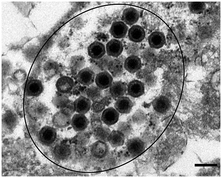 Figure 3. Icosahedral virus particles consistent with ranavirus were observed in spleen tissues (circled black). Transmission electron micrograph. Scale bar represents 200 nm.