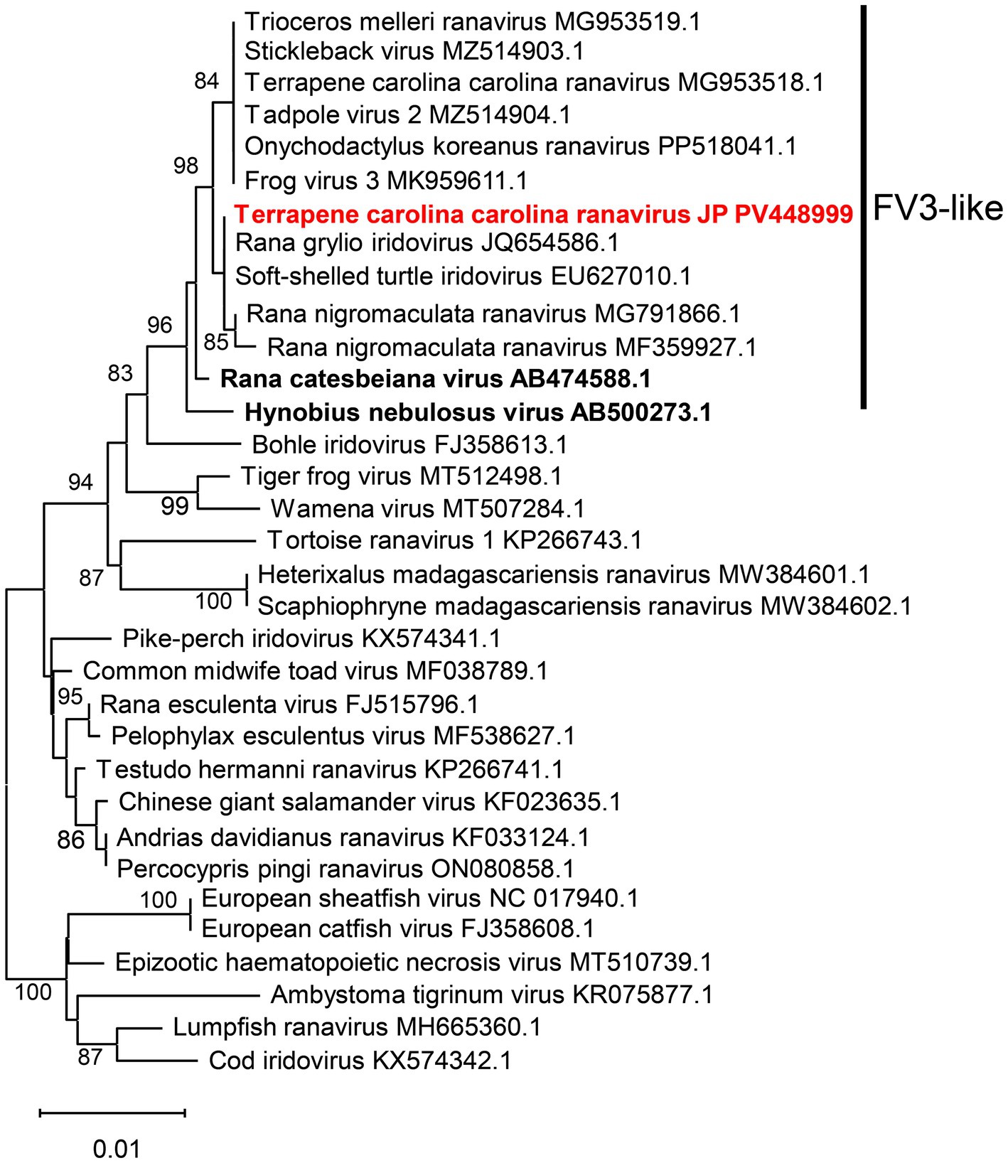 Figure 4. Phylogenetic tree of the detected ranaviruses based on the full amino acid sequences of the major capsid protein. This phylogenetic tree was constructed using 464 amino acids from the MCP gene. Sequences of the ranavirus detected in this study are shown in red. Sequences of ranaviruses previously identified in amphibians in Japan are shown in bold. GenBank accession numbers are provided for the listed viruses.