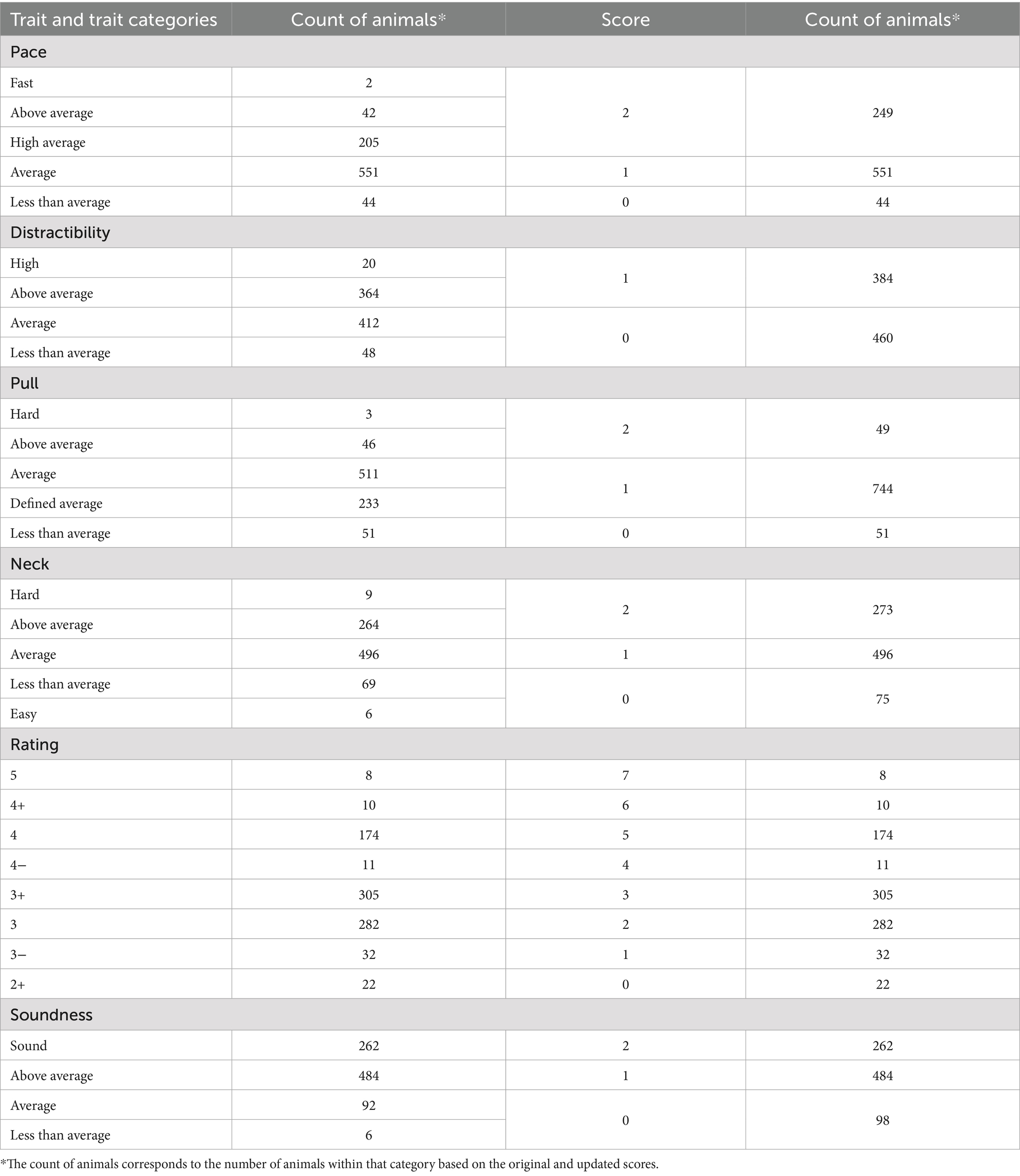 These standardized ratings provided a structured approach to evaluating each dog’s suitability for guide work and its optimal handler match. All ratings were then converted into numeric values based on the trait distributions in Table 1 to allow for consistent model combinations and performance evaluations. Pace, pull, and neck scores were condensed to allow for an ordinal scale due to the selection toward the mean so distinction between high, low, and average was needed with groups of at least 5% of the total population. For distraction and soundness, the traits were converted to binary and ordinal due to the unidirectional selection of those traits.