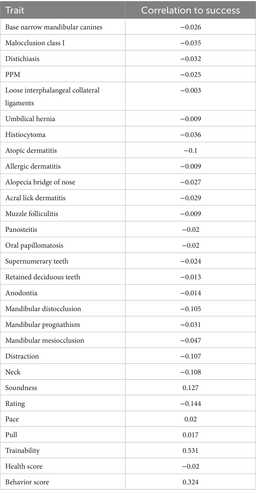 The Health Score was constructed by normalizing each health-related measure to ensure comparability. This was done by multiplying the binary status with the correlation to success for that trait. Summing these normalized trait values provided a composite Health Score that captured each dog’s overall severity of health conditions. All trait correlations to success are listed in Table 2.