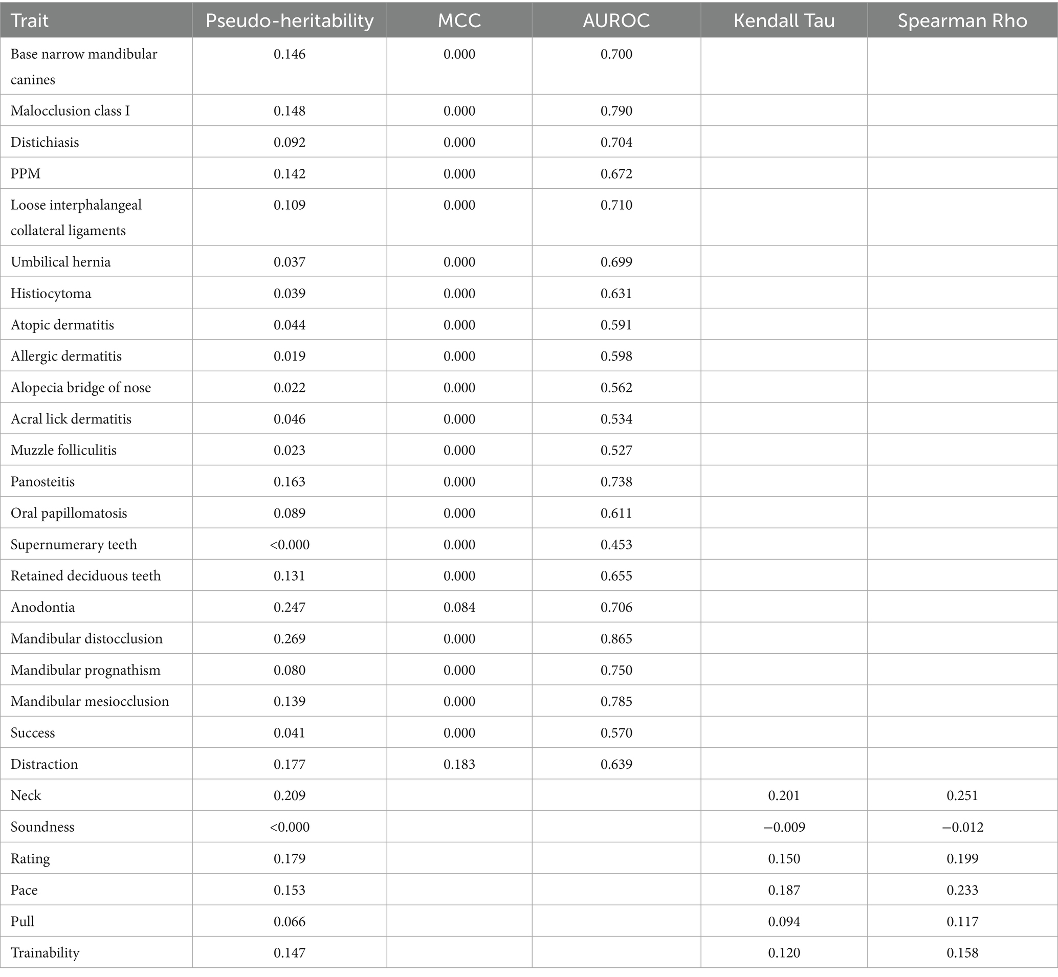 In summary, many traits showed MCC values of 0.000, indicating poor classification performance in an unbalanced dataset, yet some (e.g., mandibular distocclusion, malocclusion class I, mandibular mesiocclusion) exhibited relatively high AUROC scores (0.785–0.865), suggesting that while the model struggled to set an optimal threshold for binary classification, it still demonstrated useful ranking ability. Moreover, traits such as anodontia had an MCC greater than zero (0.084), highlighting a marginal but notable capacity for classification. These mixed results underscore the complexity of leveraging GBLUP for binary classification and are an example of the potential strengths of ranking risk compared with correct categorization. These results suggest that even with an unbalanced dataset of health traits, risk can still be a viable metric to allow for the utilization of breeding values.