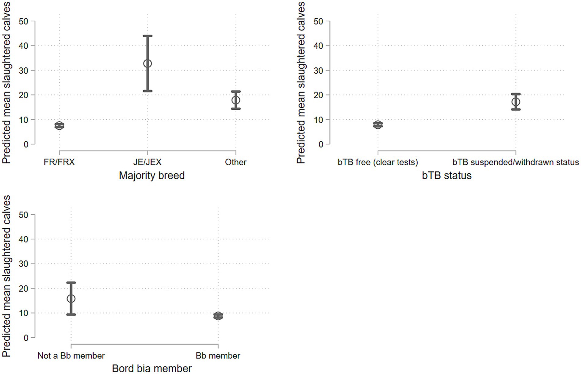 Figure 1. Predictions from a negative binomial count model predicting the mean calves slaughtered by breed, bovine TB (bTB) status and Bord Bia membership. bTB free = received clear tuberculin tests, and therefore legally free to trade; bTB suspended/withdrawn = bTB is suspected/bTB is confirmed or reactors are disclosed at an official test, and movement restrictions are imposed. FR/FRX, Friesian/Friesian-cross; JE/JEX, Jersey/Jersey-Cross. Bb, Bord Bia, state food agency who oversees a Sustainable Dairy Quality Assurance scheme.
