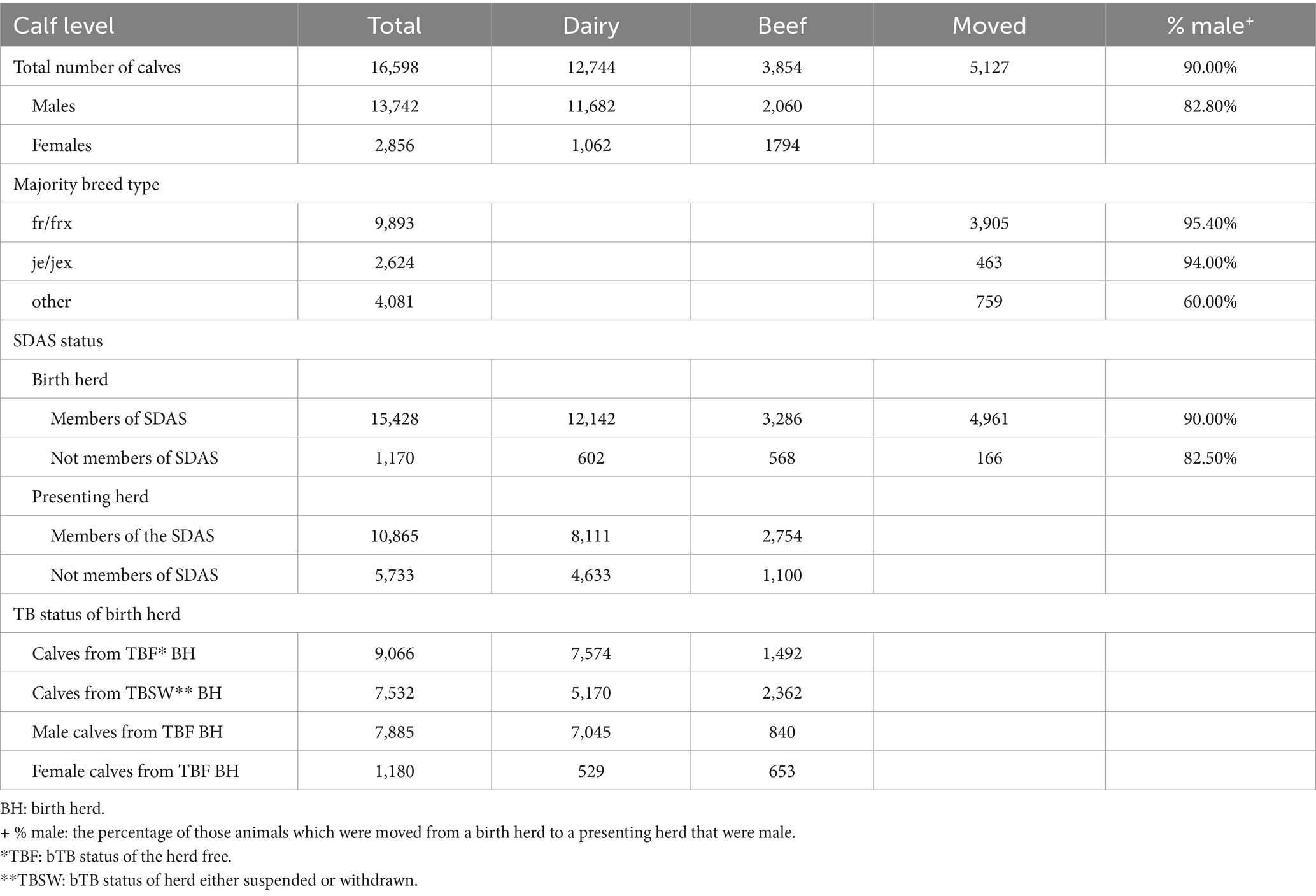 In the current study the data on ECS was collected between January 2024 and May 2024 to coincide with the peak calving period. Calf movements were obtained from the Animal Identification and Movement System (AIMS) within the Department of Agriculture, Food and the Marine. Based on the aforementioned previous study the variables selected as significant included calf breed type, sex of the calf, whether or not the birth herd or herd of presentation had membership of the SDAS, whether or not the calf had moved from the birth herd (BH) to a second herd prior to presentation (presenting herd, PH) for slaughter and finally the bTB status of the birth herd. Herd size of the birth herd was also explored as a predictor of ECS (8). Breed and breed type were as reported by the herd owner.