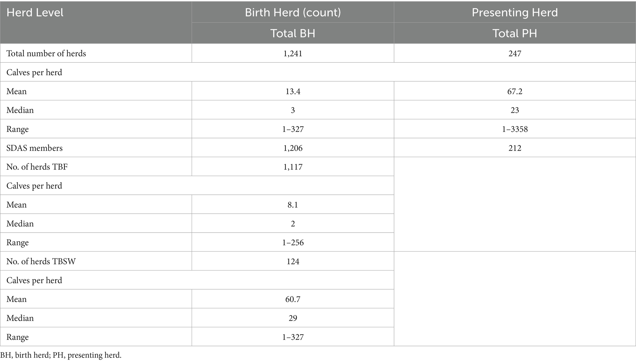 A total of 1,266 herds in the dataset sent calves to slaughter (Table 2). There were 1,241 birth herds, 97.2% (n = 1,206) of which had SDAS membership. In contrast, only 247 herds presented calves for slaughter, and of these, 85.8% (n = 212) had SDAS membership. The mean number of calves slaughtered per birth herd was 13.4 calves (median: 3, range: 1–327) whereas the mean number slaughtered per herd of presentation was 67.2 (median: 23, range: 1–3,358). The majority of birth herds of the slaughtered calves sent ≤50 (n = 1,155 herds or 93.07%), while 71 herds sent between 51 and 200 calves. Only 13 birth herds sent > 200 calves to slaughter and the maximum sent by any one herd was 327 calves. Conversely, 172 presenting herds (69.6%) slaughtered ≤50 calves, a further 59 herds slaughtered between 50 and 200 calves and 16 herds slaughtered >200 calves in the study timeframe. In contrast to the birth herds, there was a small number of herds which slaughtered very large numbers of calves, one herd alone slaughtered 3,359 calves.