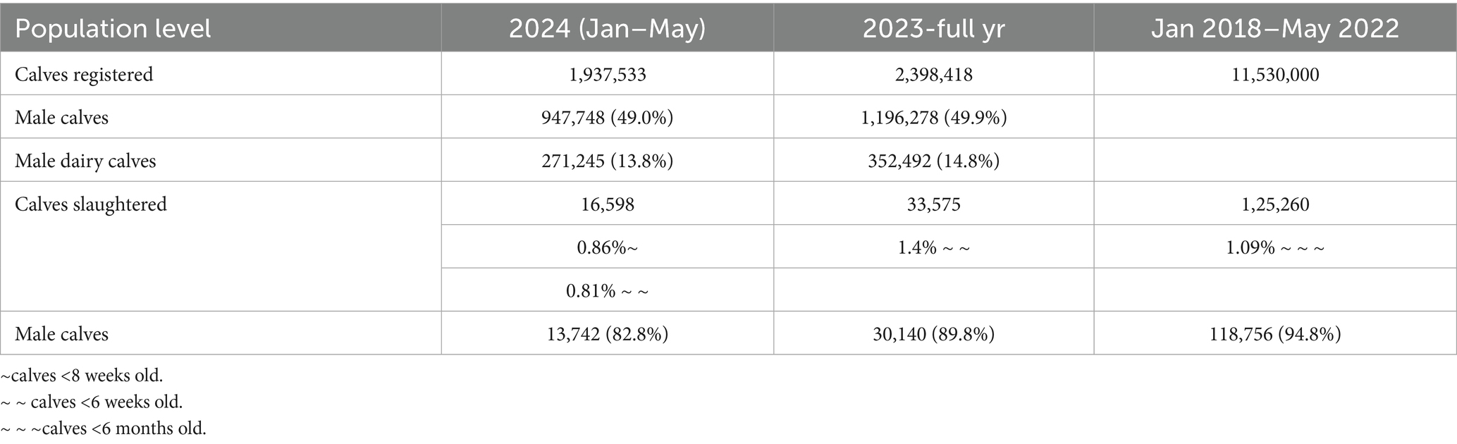 Population level data is also presented in Table 3, summarizing information for the present study relative to 2023 and 2018–2022. Importantly, there was a reduction from the 2023 slaughter rate, where the whole year ECS was 1.4% for 6-week-olds, relative to 0.81% for the 2024 calving season. The slaughter rate of 0.86% in our data set included calves ≤8 weeks old. Previous work on 2018–2022 reported on average of 1.09% of live calves were slaughtered per annum, albeit including a small number of calves up to 6 months of age. Male calves continue to represent the majority, although the absolute numbers slaughtered are trending downwards.