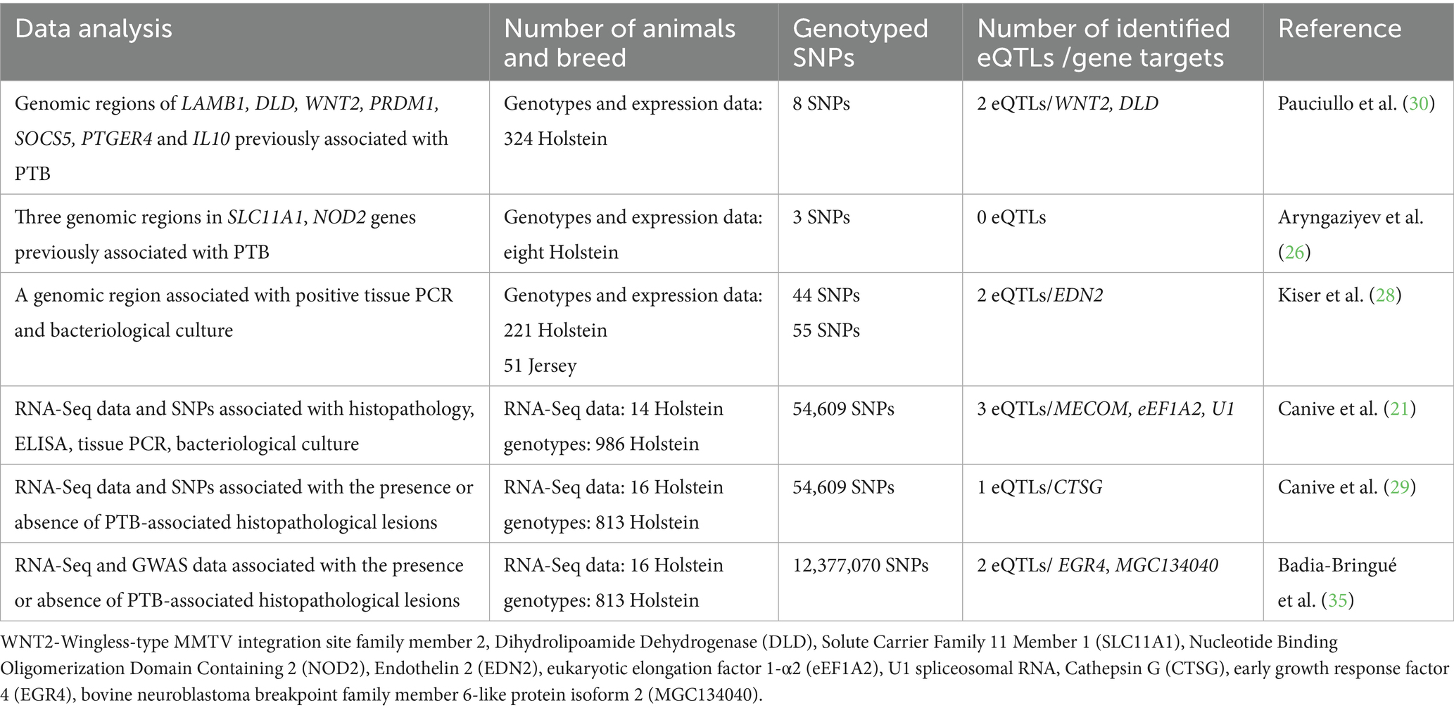 The first analysis that integrated gene expression and genotype information to identify cis-eQTLs associated with PTB phenotypes was published by Pauciullo et al. (30). The authors selected seven genes (LAMB1, DLD, WNT2, PRDM1, SOCS5, PTGER4, and IL10) based on previously published GWAS and RNA-Sequencing (RNA-Seq) studies and validated their association with MAP infection in a population of 162 Holstein cattle positive and 162 negative for MAP infection by fecal culture and ELISA. The objective of the study was to confirm whether the selected genes and SNPs were truly associated with PTB by assessing the effects of the different alleles on the binding of transcription factors. A cis-eQTL (rs43390642: G > T) in the promoter region of Wingless-type MMTV integration site family member 2 (WNT2) was associated with PTB susceptibility, suggesting a protective role of the T allele (odds ratio = 0.50). WNT signaling controls homeostatic self-renewal in several adult tissues, including the gut (31). In animals infected with PTB, MAP can cause granulomatous lesions in the distal part of the ileum, which may suggest a role for the WNT gene. The identified cis-eQTL was in linkage disequilibrium with another cis-eQTL (rs134692583: A > T) in the dihydrolipoamide dehydrogenase (DLD) previously associated with MAP infection (16). Posterior in silico analysis showed that the two cis-eQTLs were in binding sites for the transcription factor GR (30).
