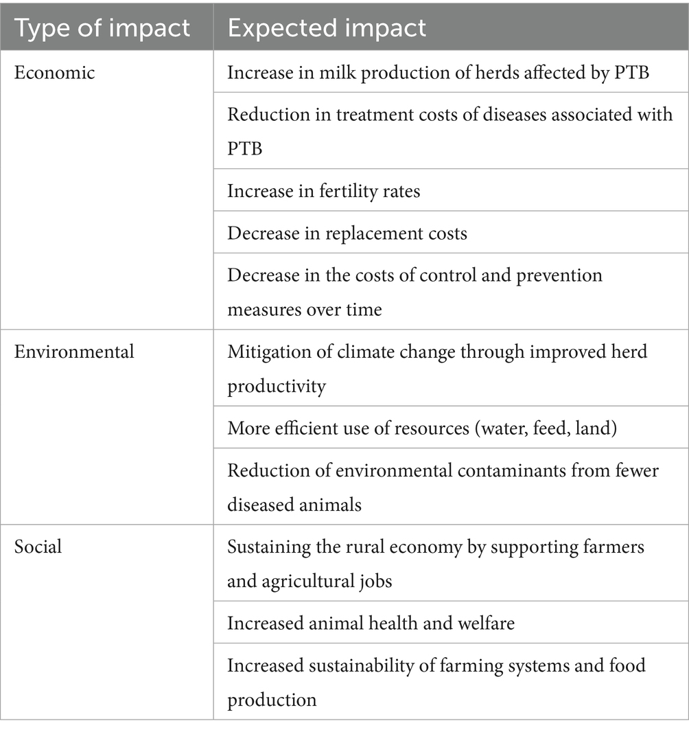 Integrating transcriptomic and genomic studies to identify eQTLs associated with bovine PTB has significantly advanced our understanding of the genetic architecture underlying susceptibility or resistance to MAP infection in cattle. Validating the functional impact of the identified cis-eQTLs through molecular approaches such as CRISPR/Cas mediated-gene editing, reporter assays, or RNA interference is essential to elucidate how specific genetic variants modulate gene expression and contribute to host susceptibility or resistance (38, 39). Validated cis-eQTLs associated with PTB phenotypes offer multiple practical applications as illustrated in Figure 2. For instance, they could enable the development of cis-eQTLs profiling assays for the rapid and cost-effective identification of genetically susceptible or resistant animals. Furthermore, these cis-eQTLs may serve as targets for innovative PTB control strategies involving gene editing technologies. In the context of animal breeding, incorporating cis-eQTL information into genomic selection programs could enhance host resistance to MAP infection. By identifying and selectively breeding cattle with increased resistance and lower susceptibility to MAP infection, producers can improve herd health, reduce economic losses, and contribute to more sustainable and resilient livestock production systems. Although genomic selection is a medium- to long-term strategy that depends on the selective pressure and the heritability of the trait, the resulting genetic gains are cumulative and heritable across generations. Early identification of susceptible animals enables more efficient resource allocation by avoiding investment in animals at higher risk of infection. Improved productivity and disease resistance would reduce the environmental footprint of the livestock industry, supporting climate change mitigation efforts. Additionally, PTB control can alleviate trade restrictions imposed on animal and dairy products in some countries enhancing international competitiveness and market access. Ensuring animal health translates into higher quality, safer products for human consumption, thereby increasing consumer confidence. Enhanced animal health and profitability, particularly for small-scale and local farms, could also stimulate generational renewal in rural communities. The socio-economic and environmental impacts of breeding for PTB resistance are summarized in Table 3.