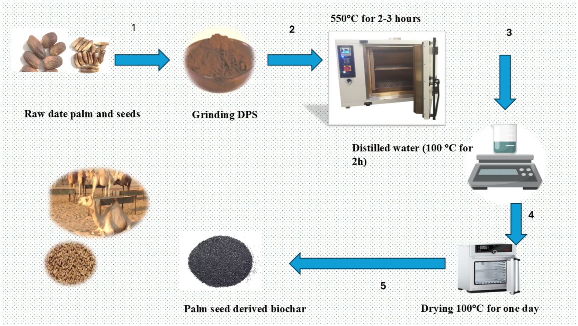 Climate change poses a significant environmental threat to all living things. In this context, camels demonstrate a degree of resilience. Interestingly, the extensive cultivation of date palms (Phoenix dactylifera) across tropical and subtropical regions produces a substantial amount of seed waste. A promising sustainable and eco-friendly strategy involves transforming this waste into biochar from PSB (38). This PSB can then be used to enhance animal feed supplements, simultaneously reducing ecological impact. For some time, various strategies have been explored to mitigate the effects of environmental stressors on livestock, including the use of phytochemicals, organic acids, and probiotics. Coinciding with these efforts, date palm cultivation has continued to generate substantial byproducts, particularly date palm seeds. These seeds have already shown success when incorporated into livestock feed, maintaining animal performance and productivity. Transforming the date palm seed waste into biochar is a game-changer (38). It tackles a major waste problem head-on and offers a powerful one-two punch: it helps make livestock, like camels, more resilient by boosting their feed, and it contributes to a much more sustainable agricultural system overall.