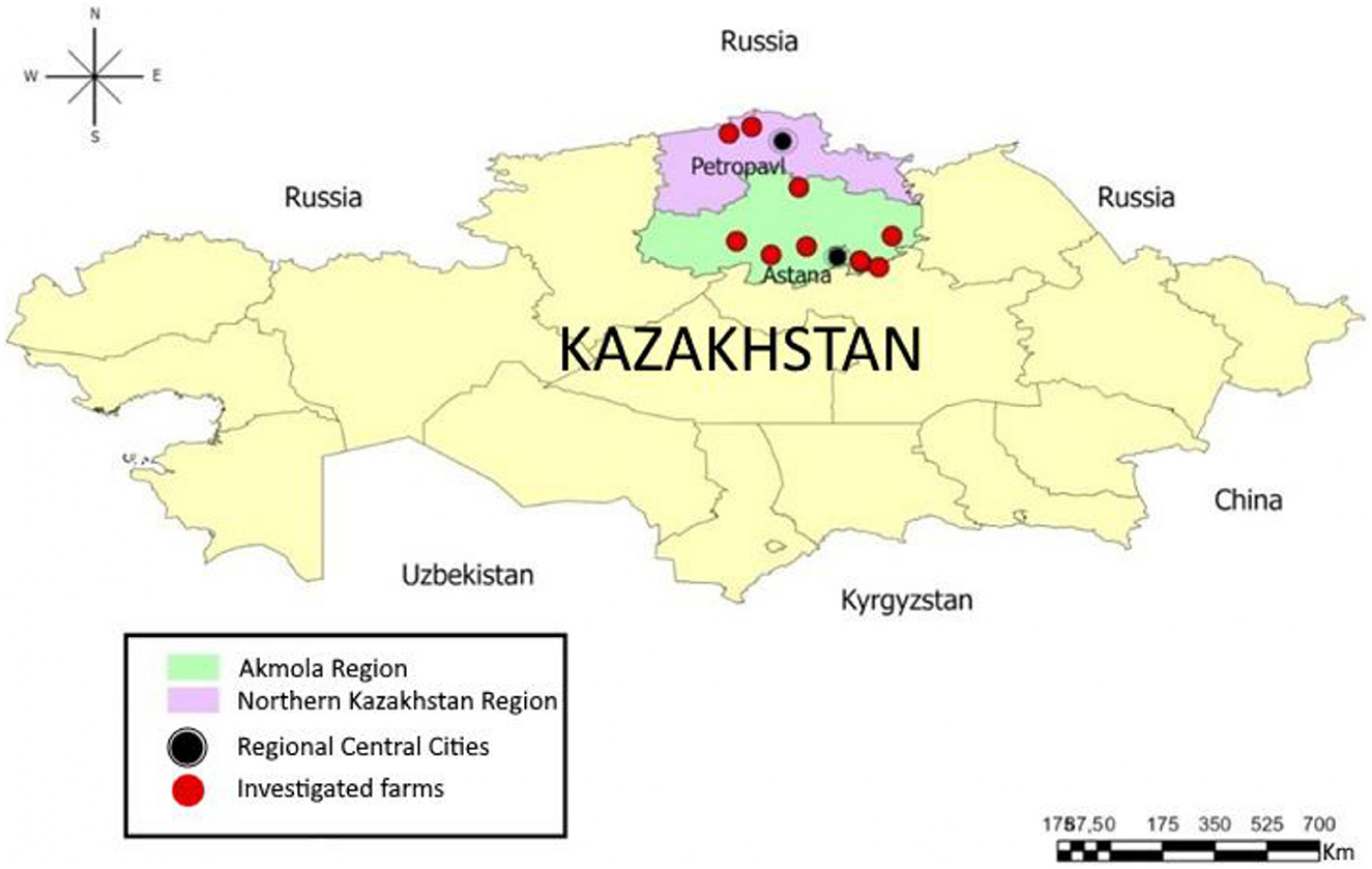 In Central and Northern Kazakhstan, the West Siberian climatic zone prevails with cold (minimum temperature −57.2°C) and long winters (up to 6 months) and short, often hot summers (maximum temperature +42°C). The average precipitation is from 300 to 450 mm (27). The natural and economic features of the regions, which are favorable to produce sufficient forage and grain crops, have contributed to the concentration of the main enterprises of the country's industrialized dairy cattle farming.