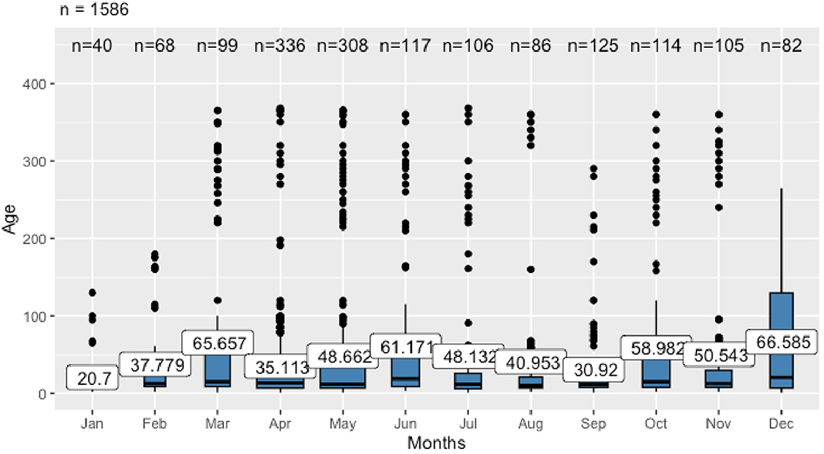 The statistical analyses were performed using the R-4.4.0 for Windows software. A one-way analysis of variance (ANOVA) was conducted to assess whether the mean age of the sampled animals differed significantly across months. The F-test was used to determine the overall significance of these differences. The data on age distribution across the months sampling were visualized using boxplots, with the average age for each month represented.