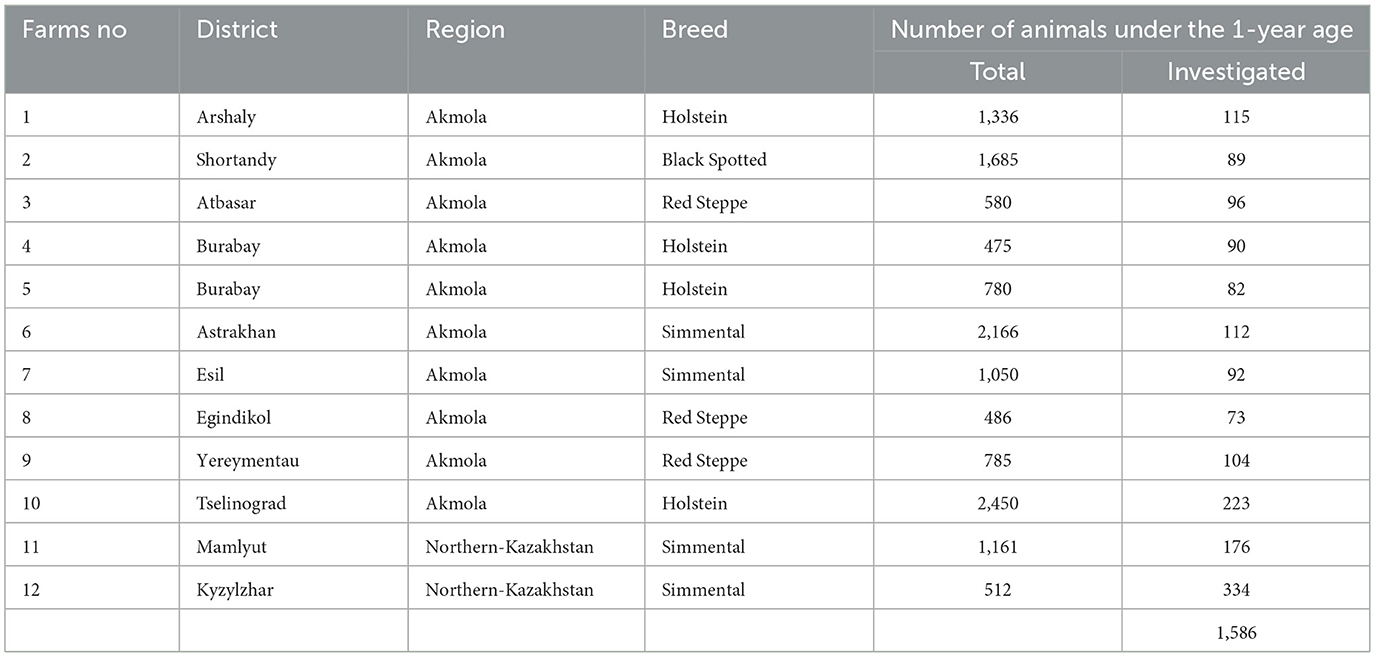 During the field expeditions we used the stratified random sampling (28) and the population of calves in all dairy farms was categorized into age groups (1–30, 31–90, 91–120, and >120 days). A total of 1,586 feces samples were collected from calves on 12 industrialized dairy farms out of 48 milk production cattle enterprises (2) located in 11 districts of the Akmola and Northern Kazakhstan regions (Figure 1). The farms were selected for their similarity in housing, management, and feeding technologies. The study population included 12,416 calves under 1 year of age, with the number of animals per farm ranging from 475 to 1,685. The sampling strategy aimed for a representation exceeding 10% within each age group, subject to the availability of animals in those groups (Table 1).