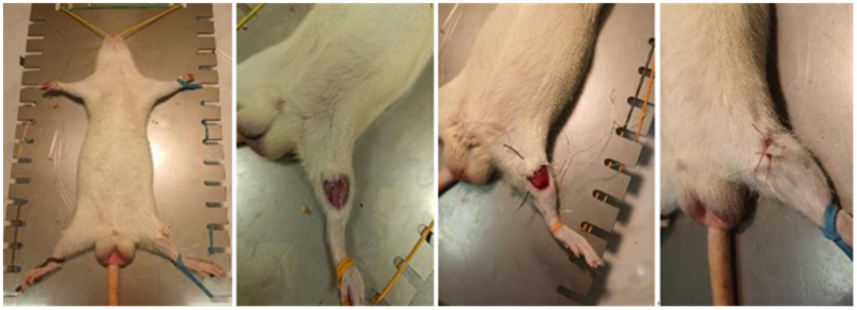 All surgical procedures were performed by qualified personnel. After anesthesia of the rats, a 1 cm long surgical discission was made on the right hindlimb. The muscles were spread apart without injury for wider access to the bone. An incision was made in the bone in the area of the tibia proximal epiphysis without displacement or fragments. The surgical wound was then closed with a knotted suture made of non-absorbable material (Figure 1).