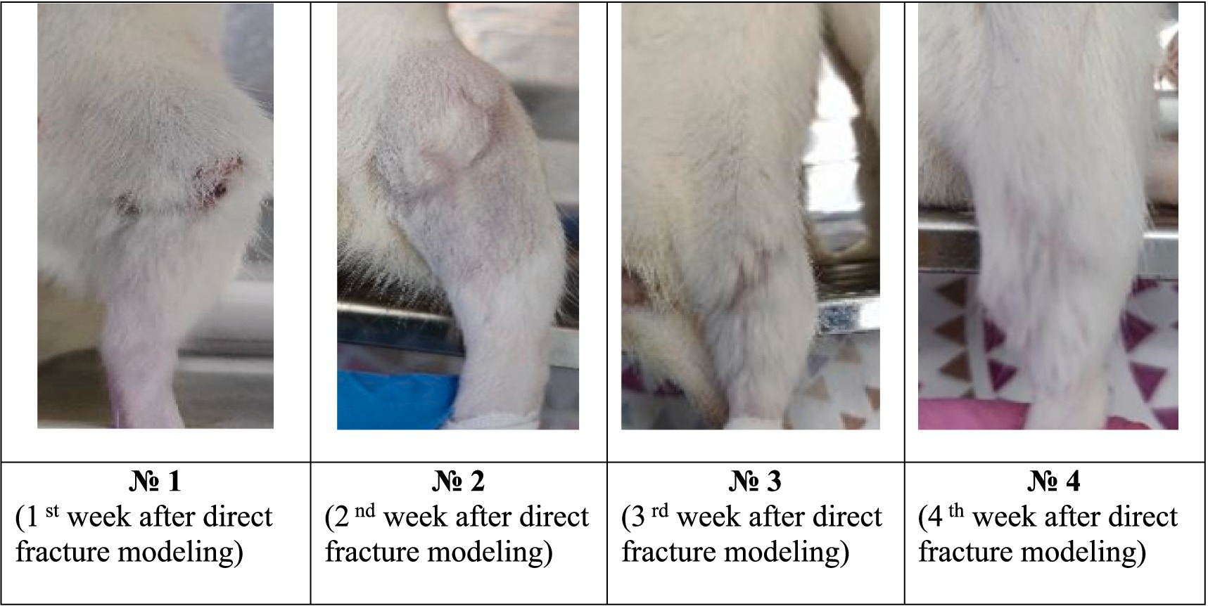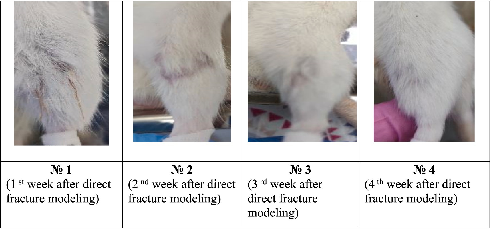 While processing radiographic data, it was revealed the destructive changes in the tibia were observed in the images of all the animals, expressed in bone damage without displacement with minor bone fragments near the modeled fracture area.