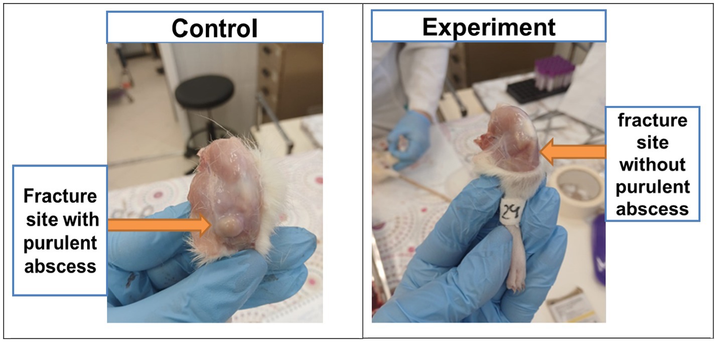 The inflammation aseptic nature in the post-surgery wound had a positive effect on bone regeneration. On the one hand, this helped to avoid infection in the fracture area, and on the other hand, there was inflammatory reactions decrease due to diminishing the bacterial load. In our preclinical trials, this was confirmed by the hematological tests, in which the leukocytes level in the experimental group remained within the norms or slightly increased.