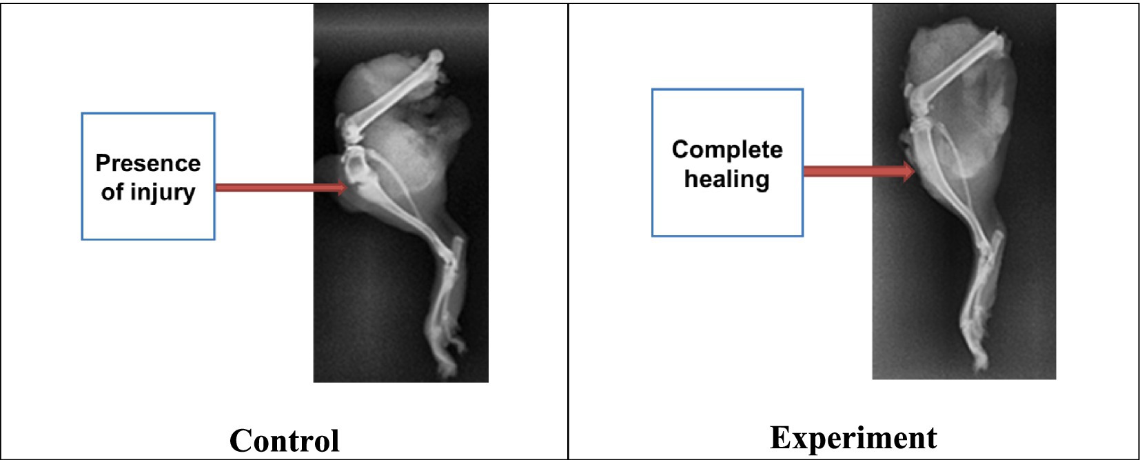 By the 21st day, all animals in the experimental group had shown almost complete recovery by primary healing with signs of complete consolidation, without secondary signs of fibrosis formation. In the control group, only one animal had demonstrated primary bone healing with 95% confidence, as well as clear and certain consolidation without weakening in the fracture zone (Figure 5).