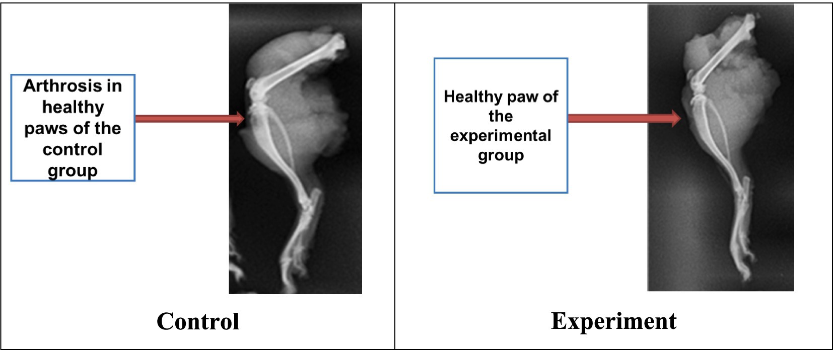 Blood sampling for analysis and amputation of the hind limbs of the animals was performed weekly throughout the experiment: 6 animals were removed from each group by decapitation. After examination, all the collected paw samples were sent for X-ray examination.