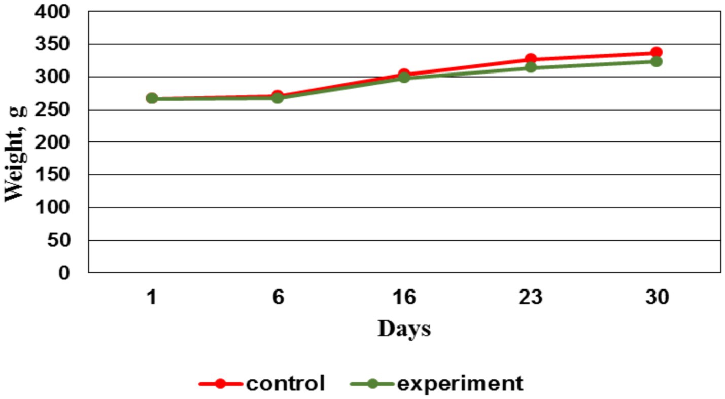 When assessing the animals body weight throughout the experiment, no significant difference in weight indicators was found between the control and experimental groups (Figure 7).