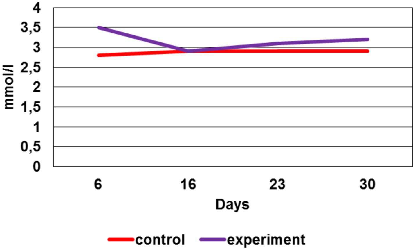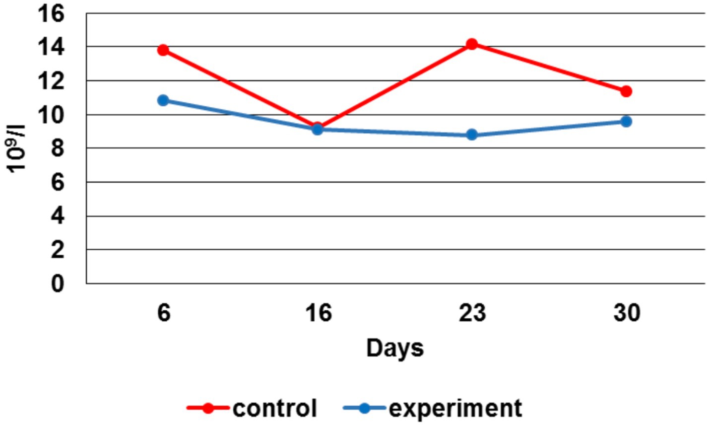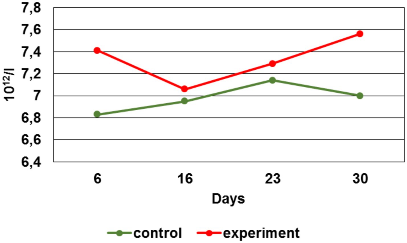 By the 6 th day, the leukocytes number in the experimental group was 28% lower, by the 16 th day - 1%, by the 23 rd day — 61%, by the 30 th - 19% vs. the control group. When comparing the erythrocytes number average values during the experiment, their increase in the experimental group can be noted by the 6 th, 23 rd and 30 th day in respect to the control group (Figure 9).